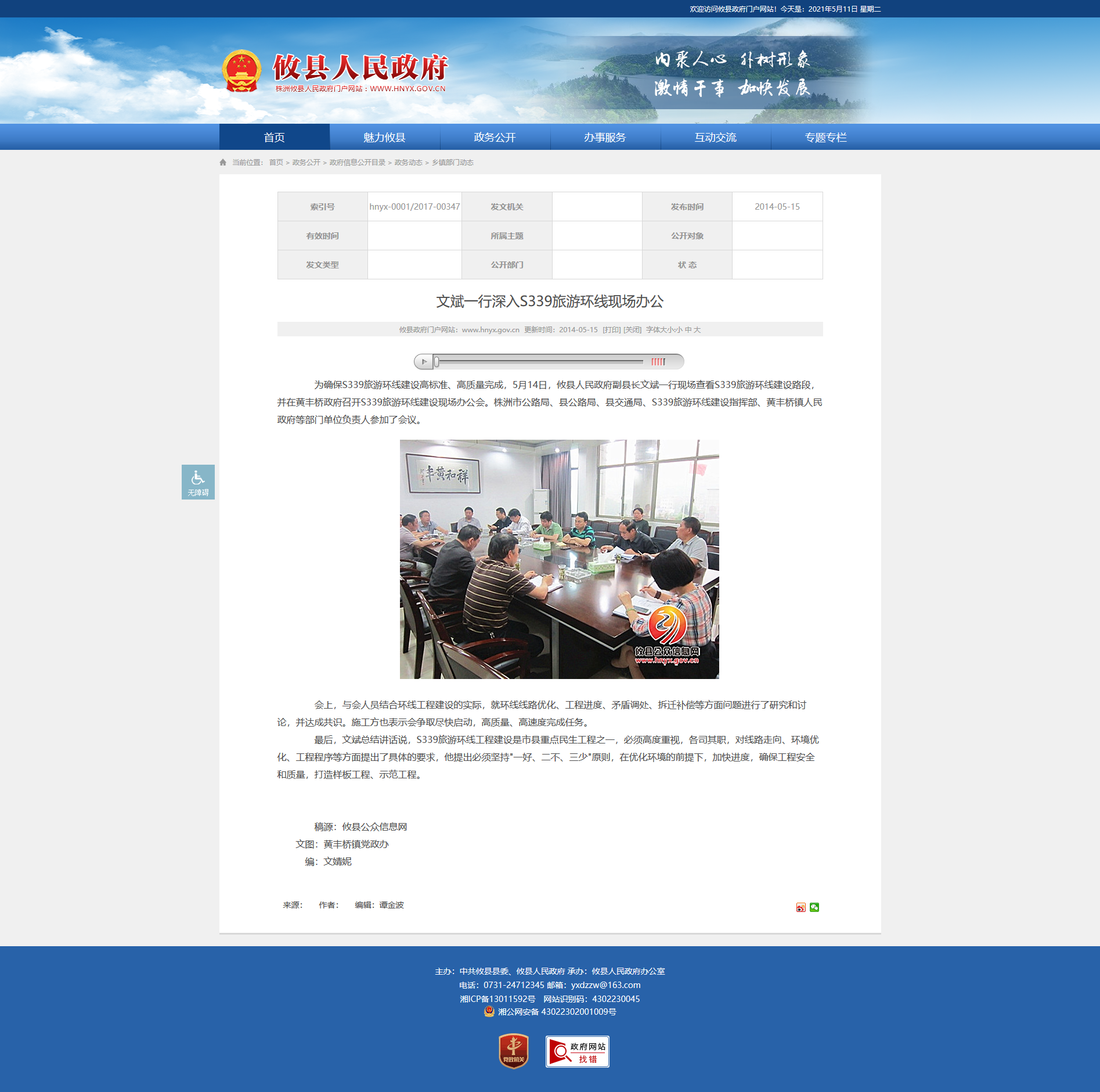 为确保S339旅游环线建设高标准、高质量完成,5月14日,攸县人民政府副县长文斌一行现场查看S339旅游环线建设路段,并在黄丰桥政府召开S339旅游环线建设现场办公会。株洲市公路局、县公路局、县交通局、S339旅游环线建设指挥部、黄丰桥镇人民政府等部门单位负责人参加了会议。