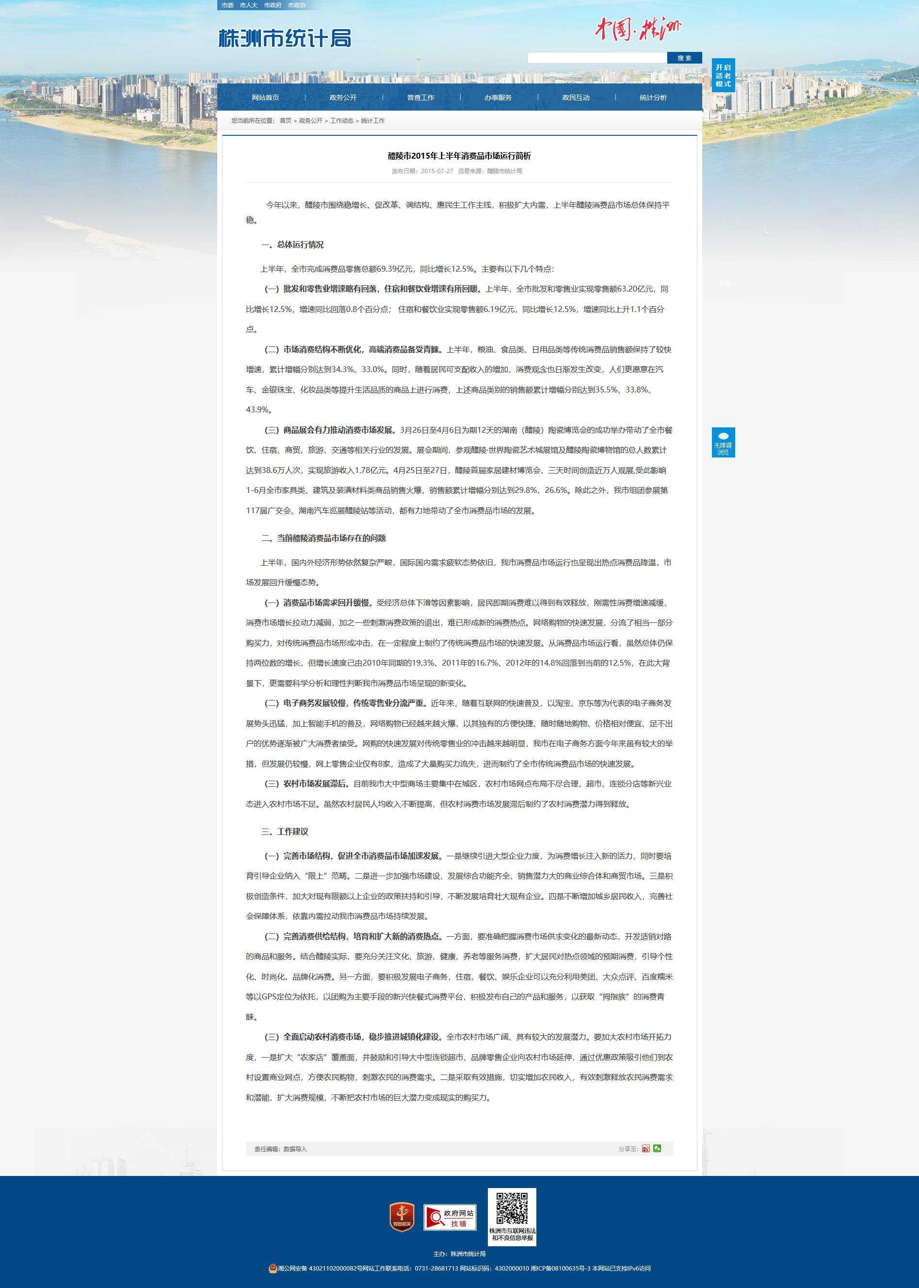 一、总体运行情况上半年,全市完成消费品零售总额69.39亿元,同比增长12.5%。主要有以下几个特点:(一)批发和零售业增速略有回落,住宿和餐饮业增速有所回暖。上半年,全市批发和零售业实现零售额63.20亿元,同比增长12.5%,增速同比回落0.8个百分点; 住宿和餐饮业实现零售额6.19亿元,同比增长12.5%,增速同比上升1.1个百分点。(二)市场消费结构不断优化,高端消费品备受青睐。上半年,粮油、食品类、日用品类等传统消费品销售额保持了较快增速,累计增幅分别达到34.3%、33.0%。同时,随着居民可支配收入的增加,消费观念也日渐发生改变,人们更愿意在汽车、金银珠宝、化妆品类等提升生活品质的商品上进行消费,上述商品类别的销售额累计增幅分别达到35.5%、33.8%、43.9%。(三)商品展会有力推动消费市场发展。3月26日至4月6日为期12天的湖南(醴陵)陶瓷博览会的成功举办带动了全市餐饮、住宿、商贸、旅游、交通等相关行业的发展。展会期间,参观醴陵·世界陶瓷艺术城展馆及醴陵陶瓷博物馆的总人数累计达到38.6万人次,实现旅游收入1.78亿元。4月25日至27日,醴陵首届家居建材博览会,三天时间创造近万人观展,受此影响1-6月全市家具类、建筑及装潢材料类商品销售火爆,销售额累计增幅分别达到29.8%、26.6%。除此之外,我市组团参展第117届广交会、湖南汽车巡展醴陵站等活动,都有力地带动了全市消费品市场的发展。二、当前醴陵消费品市场存在的问题上半年,国内外经济形势依然复杂严峻,国际国内需求疲软态势依旧,我市消费品市场运行也呈现出热点消费品降温,市场发展回升缓慢态势。(一)消费品市场需求回升缓慢。受经济总体下滑等因素影响,居民即期消费难以得到有效释放,刚需性消费增速减缓,消费市场增长拉动力减弱,加之一些刺激消费政策的退出,难已形成新的消费热点。网络购物的快速发展,分流了相当一部分购买力,对传统消费品市场形成冲击,在一定程度上制约了传统消费品市场的快速发展。从消费品市场运行看,虽然总体仍保持两位数的增长,但增长速度己由2010年同期的19.3%、2011年的16.7%、2012年的14.8%回落到当前的12.5%,在此大背景下,更需要科学分析和理性判断我市消费品市场呈现的新变化。(二)电子商务发展较慢,传统零售业分流严重。近年来,随着互联网的快速普及,以淘宝、京东等为代表的电子商务发展势头迅猛,加上智能手机的普及,网络购物已经越来越火爆,以其独有的方便快捷、随时随地购物、价格相对便宜、足不出户的优势逐渐被广大消费者接受。网购的快速发展对传统零售业的冲击越来越明显,我市在电子商务方面今年来虽有较大的举措,但发展仍较慢,网上零售企业仅有8家,造成了大量购买力流失,进而制约了全市传统消费品市场的快速发展。(三)农村市场发展滞后。目前我市大中型商场主要集中在城区,农村市场网点布局不尽合理,超市、连锁分店等新兴业态进入农村市场不足。虽然农村居民人均收入不断提高,但农村消费市场发展滞后制约了农村消费潜力得到释放。三、工作建议(一)完善市场结构,促进全市消费品市场加速发展。一是继续引进大型企业力度,为消费增长注入新的活力,同时要培育引导企业纳入“限上”范畴。二是进一步加强市场建设,发展综合功能齐全、销售潜力大的商业综合体和商贸市场。三是积极创造条件,加大对现有限额以上企业的政策扶持和引导,不断发展培育壮大现有企业。四是不断增加城乡居民收入,完善社会保障体系,依靠内需拉动我市消费品市场持续发展。(二)完善消费供给结构,培育和扩大新的消费热点。一方面,要准确把握消费市场供求变化的最新动态,开发适销对路的商品和服务。结合醴陵实际,要充分关注文化、旅游、健康、养老等服务消费,扩大居民对热点领域的预期消费,引导个性化、时尚化、品牌化消费。另一方面,要积极发展电子商务,住宿、餐饮、娱乐企业可以充分利用美团、大众点评、百度糯米等以GPS定位为依托,以团购为主要手段的新兴快餐式消费平台,积极发布自己的产品和服务,以获取“拇指族”的消费青睐。(三)全面启动农村消费市场,稳步推进城镇化建设。全市农村市场广阔、具有较大的发展潜力。要加大农村市场开拓力度,一是扩大“农家店”覆盖面,并鼓励和引导大中型连锁超市、品牌零售企业向农村市场延伸,通过优惠政策吸引他们到农村设置商业网点,方便农民购物,刺激农民的消费需求。二是采取有效措施,切实增加农民收入,有效刺激释放农民消费需求和潜能,扩大消费规模,不断把农村市场的巨大潜力变成现实的购买力。
