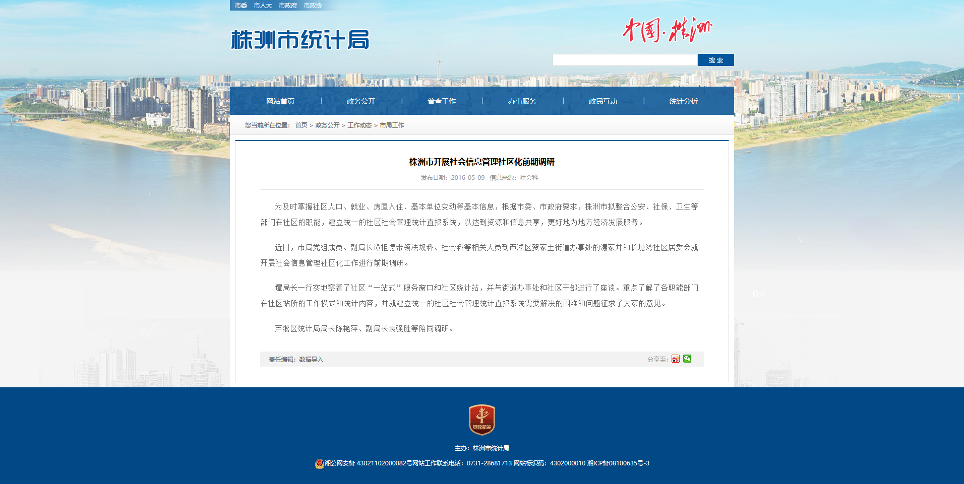 为及时掌握社区人口、就业、房屋入住、基本单位变动等基本信息,根据市委、市政府要求,株洲市拟整合公安、社保、卫生等部门在社区的职能,建立统一的社区社会管理统计直报系统,以达到资源和信息共享,更好地为地方经济发展服务。