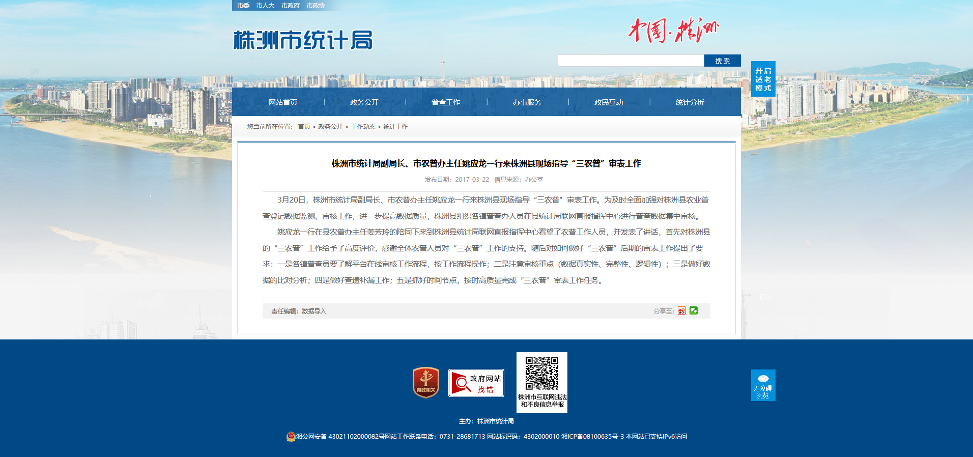3月20日,株洲市统计局副局长、市农普办主任姚应龙一行来株洲县现场指导“三农普”审表工作。为及时全面加强对株洲县农业普查登记数据监测、审核工作,进一步提高数据质量,株洲县组织各镇普查办人员在县统计局联网直报指挥中心进行普查数据集中审核。姚应龙一行在县农普办主任姜芳玲的陪同下来到株洲县统计局联网直报指挥中心看望了农普工作人员,并发表了讲话,首先对株洲县的“三农普”工作给予了高度评价,感谢全体农普人员对“三农普”工作的支持。随后对如何做好“三农普”后期的审表工作提出了要求:一是各镇普查员要了解平台在线审核工作流程,按工作流程操作;二是注意审核重点(数据真实性、完整性、逻辑性);三是做好数据的比对分析;四是做好查遗补漏工作;五是抓好时间节点,按时高质量完成“三农普”审表工作任务。
