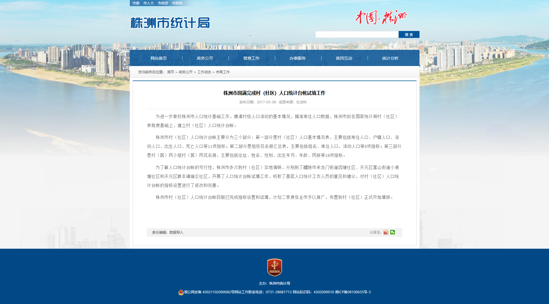株洲市村(社区)人口统计台帐目前已完成指标设置和试填,计划二季度在全市予以推广,布置到村(社区)正式开始填报。
