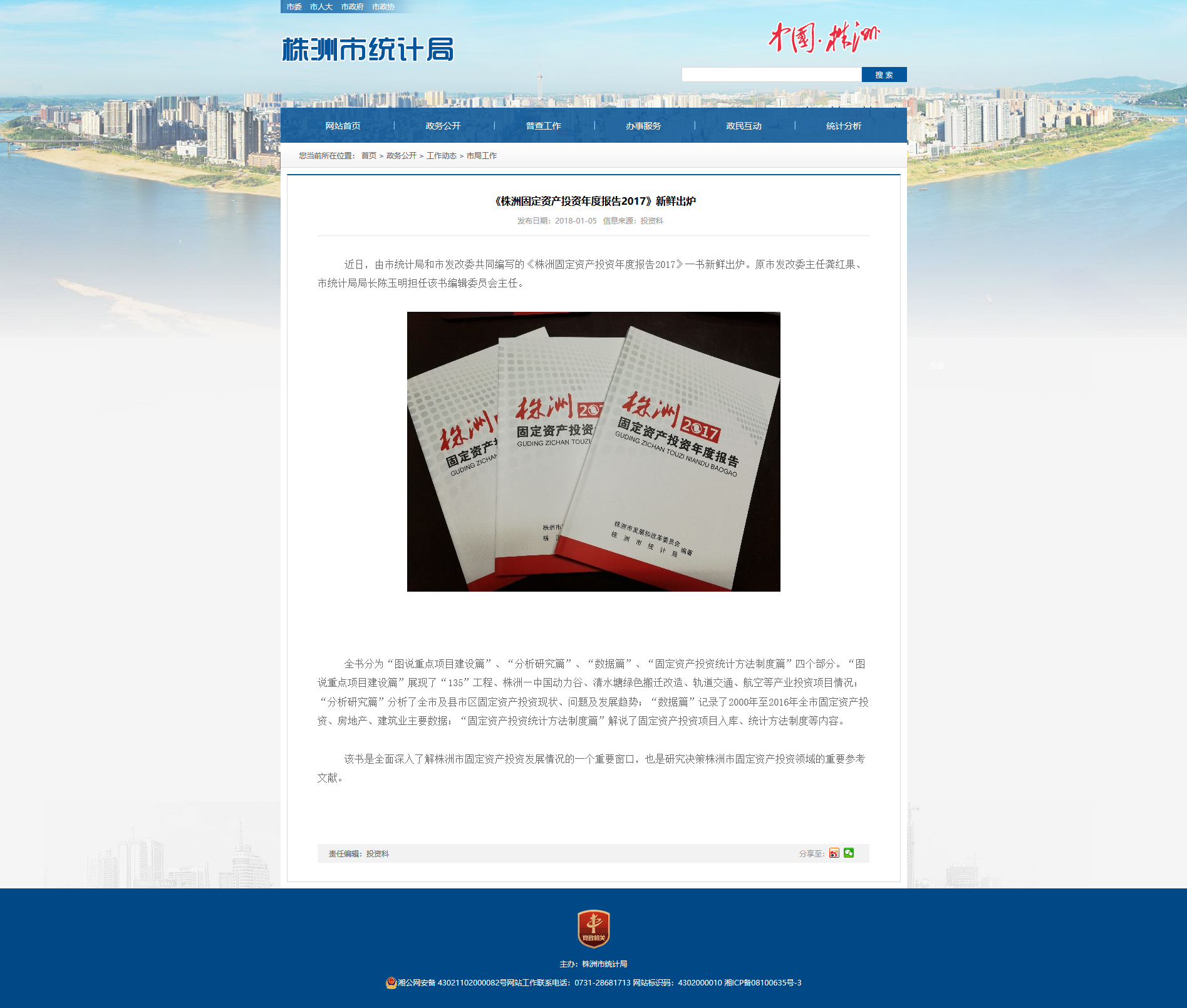 近日,由市统计局和市发改委共同编写的《株洲固定资产投资年度报告2017》一书新鲜出炉。原市发改委主任龚红果、市统计局局长陈玉明担任该书编辑委员会主任。