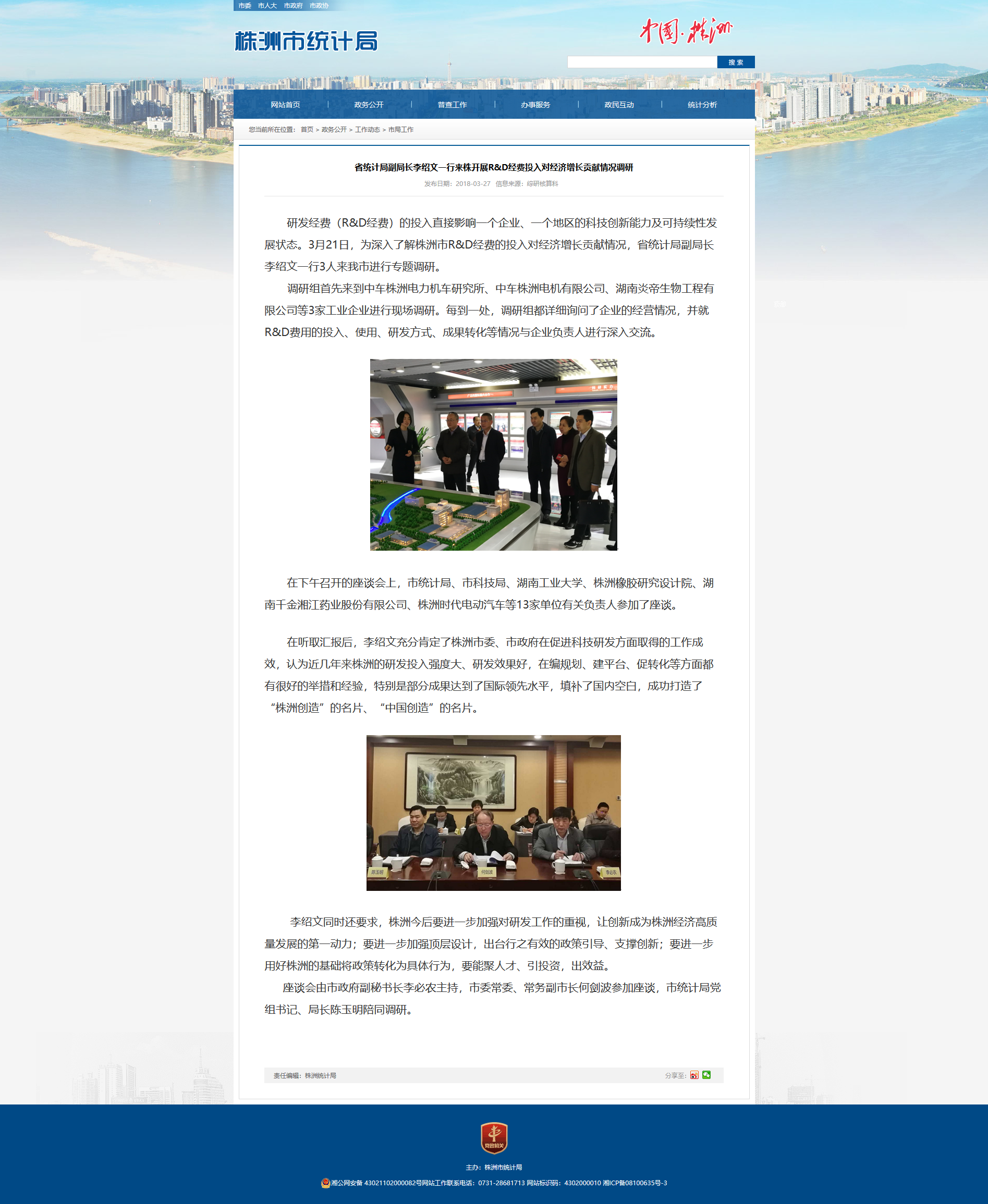 研发经费(R&D经费)的投入直接影响一个企业、一个地区的科技创新能力及可持续性发展状态。3月21日,为深入了解株洲市R&D经费的投入对经济增长贡献情况,省统计局副局长李绍文一行3人来我市进行专题调研。