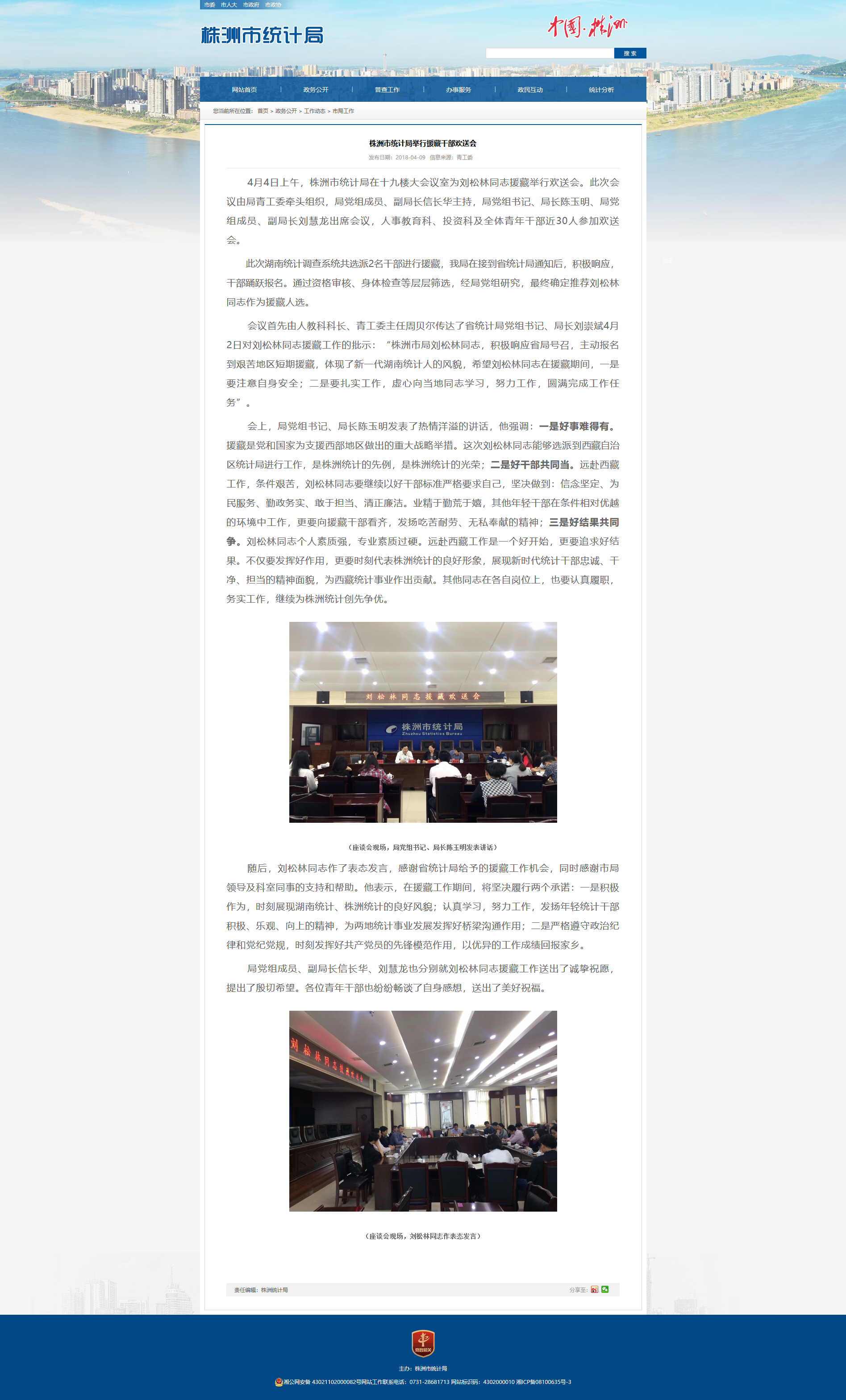 4月4日上午,株洲市统计局在十九楼大会议室为刘松林同志援藏举行欢送会。此次会议由局青工委牵头组织,局党组成员、副局长信长华主持,局党组书记、局长陈玉明、局党组成员、副局长刘慧龙出席会议,人事教育科、投资科及全体青年干部近30人参加欢送会。此次湖南统计调查系统共选派2名干部进行援藏,我局在接到省统计局通知后,积极响应,干部踊跃报名。通过资格审核、身体检查等层层筛选,经局党组研究,最终确定推荐刘松林同志作为援藏人选。会议首先由人教科科长、青工委主任周贝尔传达了省统计局党组书记、局长刘崇斌4月2日对刘松林同志援藏工作的批示:“株洲市局刘松林同志,积极响应省局号召,主动报名到艰苦地区短期援藏,体现了新一代湖南统计人的风貌,希望刘松林同志在援藏期间,一是要注意自身安全;二是要扎实工作,虚心向当地同志学习,努力工作,圆满完成工作任务”。会上,局党组书记、局长陈玉明发表了热情洋溢的讲话,他强调:一是好事难得有。援藏是党和国家为支援西部地区做出的重大战略举措。这次刘松林同志能够选派到西藏自治区统计局进行工作,是株洲统计的先例,是株洲统计的光荣;二是好干部共同当。远赴西藏工作,条件艰苦,刘松林同志要继续以好干部标准严格要求自己,坚决做到:信念坚定、为民服务、勤政务实、敢于担当、清正廉洁。业精于勤荒于嬉,其他年轻干部在条件相对优越的环境中工作,更要向援藏干部看齐,发扬吃苦耐劳、无私奉献的精神;三是好结果共同争。刘松林同志个人素质强,专业素质过硬。远赴西藏工作是一个好开始,更要追求好结果。不仅要发挥好作用,更要时刻代表株洲统计的良好形象,展现新时代统计干部忠诚、干净、担当的精神面貌,为西藏统计事业作出贡献。其他同志在各自岗位上,也要认真履职,务实工作,继续为株洲统计创先争优。