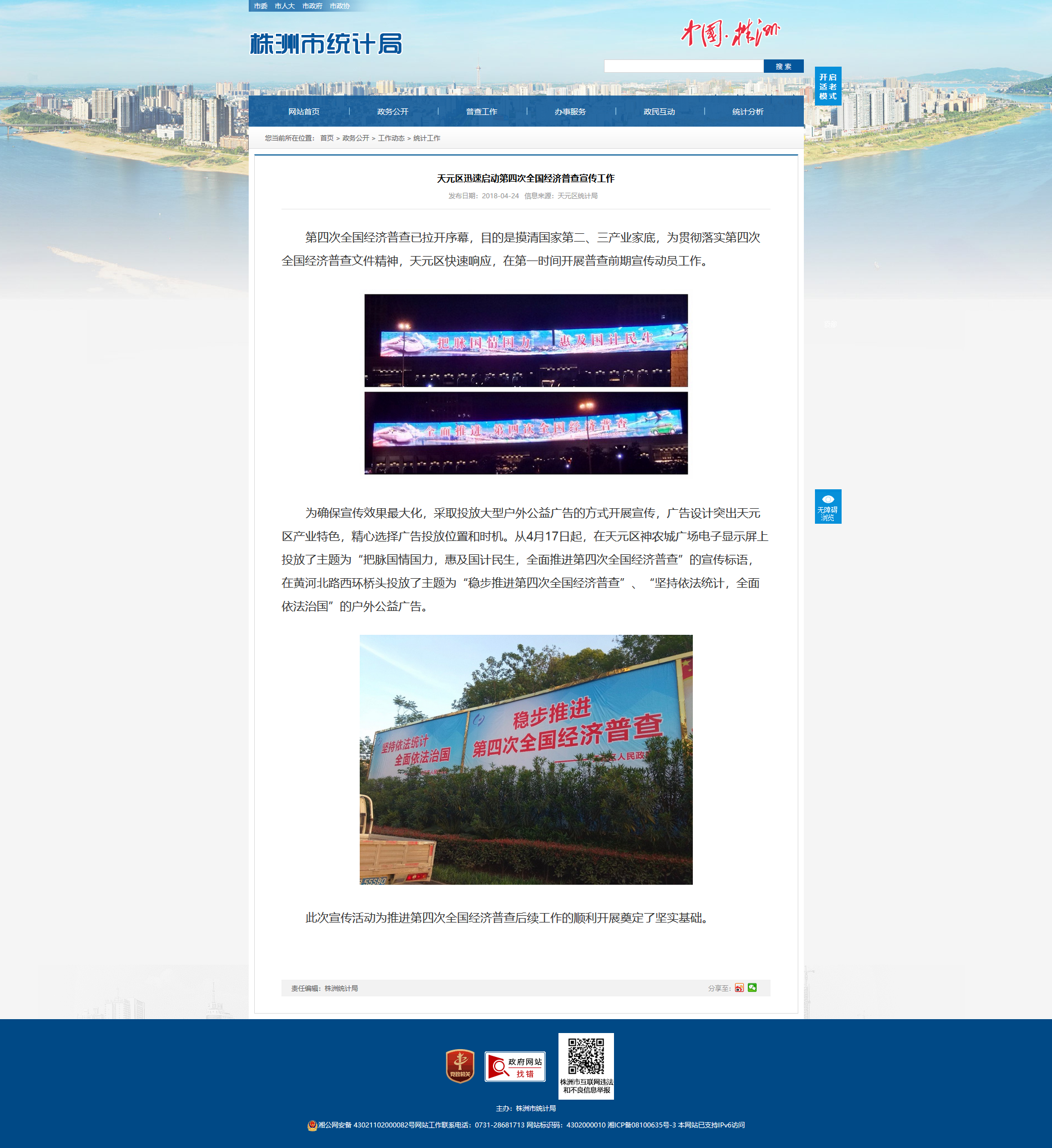 为确保宣传效果最大化,采取投放大型户外公益广告的方式开展宣传,广告设计突出天元区产业特色,精心选择广告投放位置和时机。从4月17日起,在天元区神农城广场电子显示屏上投放了主题为“把脉国情国力,惠及国计民生,全面推进第四次全国经济普查”的宣传标语,在黄河北路西环桥头投放了主题为“稳步推进第四次全国经济普查”、“坚持依法统计,全面依法治国”的户外公益广告。