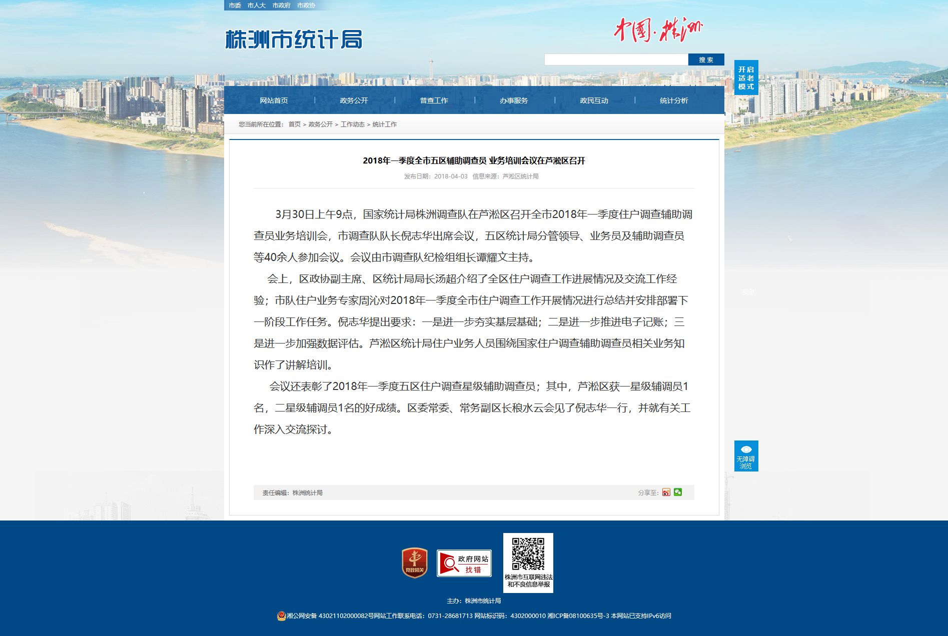 3月30日上午9点,国家统计局株洲调查队在芦淞区召开全市2018年一季度住户调查辅助调查员业务培训会,市调查队队长倪志华出席会议,五区统计局分管领导、业务员及辅助调查员等40余人参加会议。会议由市调查队纪检组组长谭耀文主持。