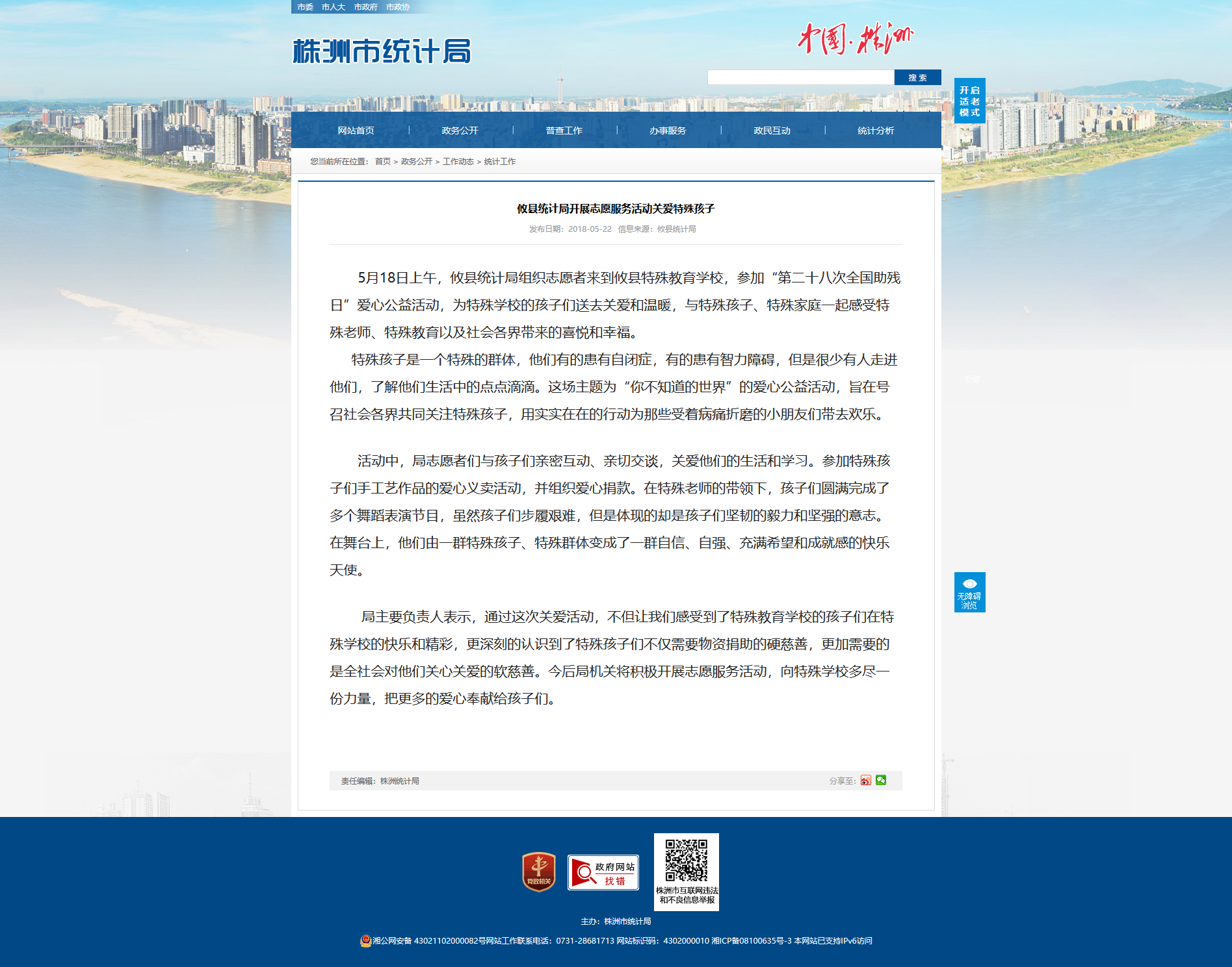 5月18日上午,攸县统计局组织志愿者来到攸县特殊教育学校,参加“第二十八次全国助残日”爱心公益活动,为特殊学校的孩子们送去关爱和温暖,与特殊孩子、特殊家庭一起感受特殊老师、特殊教育以及社会各界带来的喜悦和幸福。