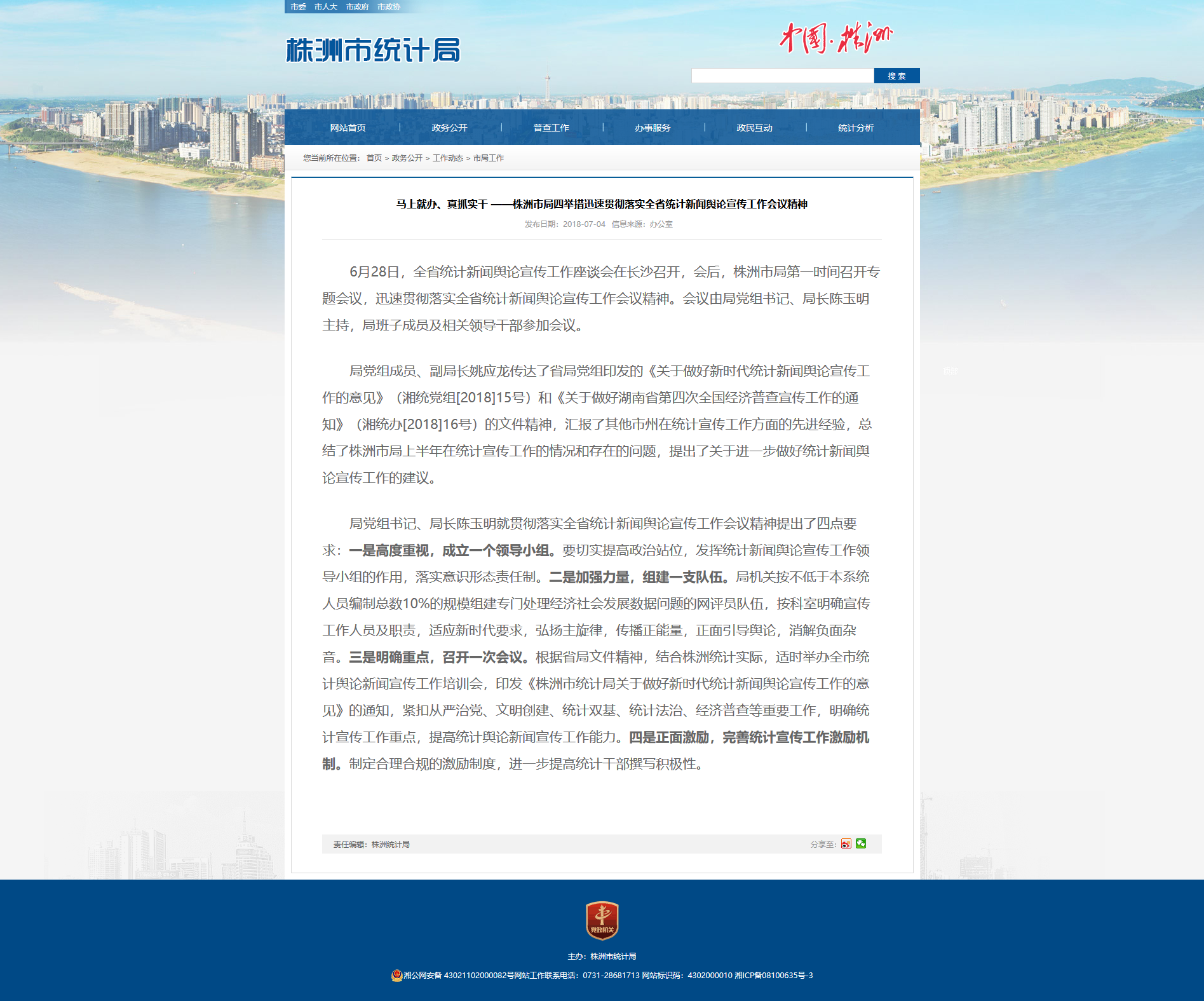 局党组成员、副局长姚应龙传达了省局党组印发的《关于做好新时代统计新闻舆论宣传工作的意见》(湘统党组[2018]15号)和《关于做好湖南省第四次全国经济普查宣传工作的通知》(湘统办[2018]16号)的文件精神,汇报了其他市州在统计宣传工作方面的先进经验,总结了株洲市局上半年在统计宣传工作的情况和存在的问题,提出了关于进一步做好统计新闻舆论宣传工作的建议。