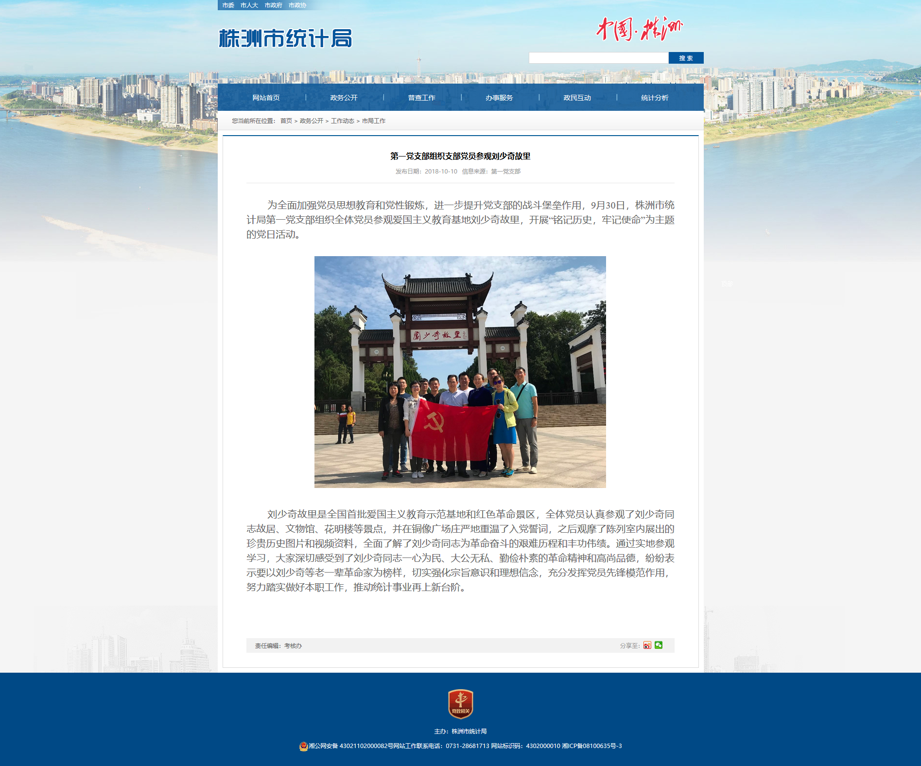 为全面加强党员思想教育和党性锻炼,进一步提升党支部的战斗堡垒作用,9月30日,株洲市统计局第一党支部组织全体党员参观爱国主义教育基地刘少奇故里,开展“铭记历史,牢记使命”为主题的党日活动。