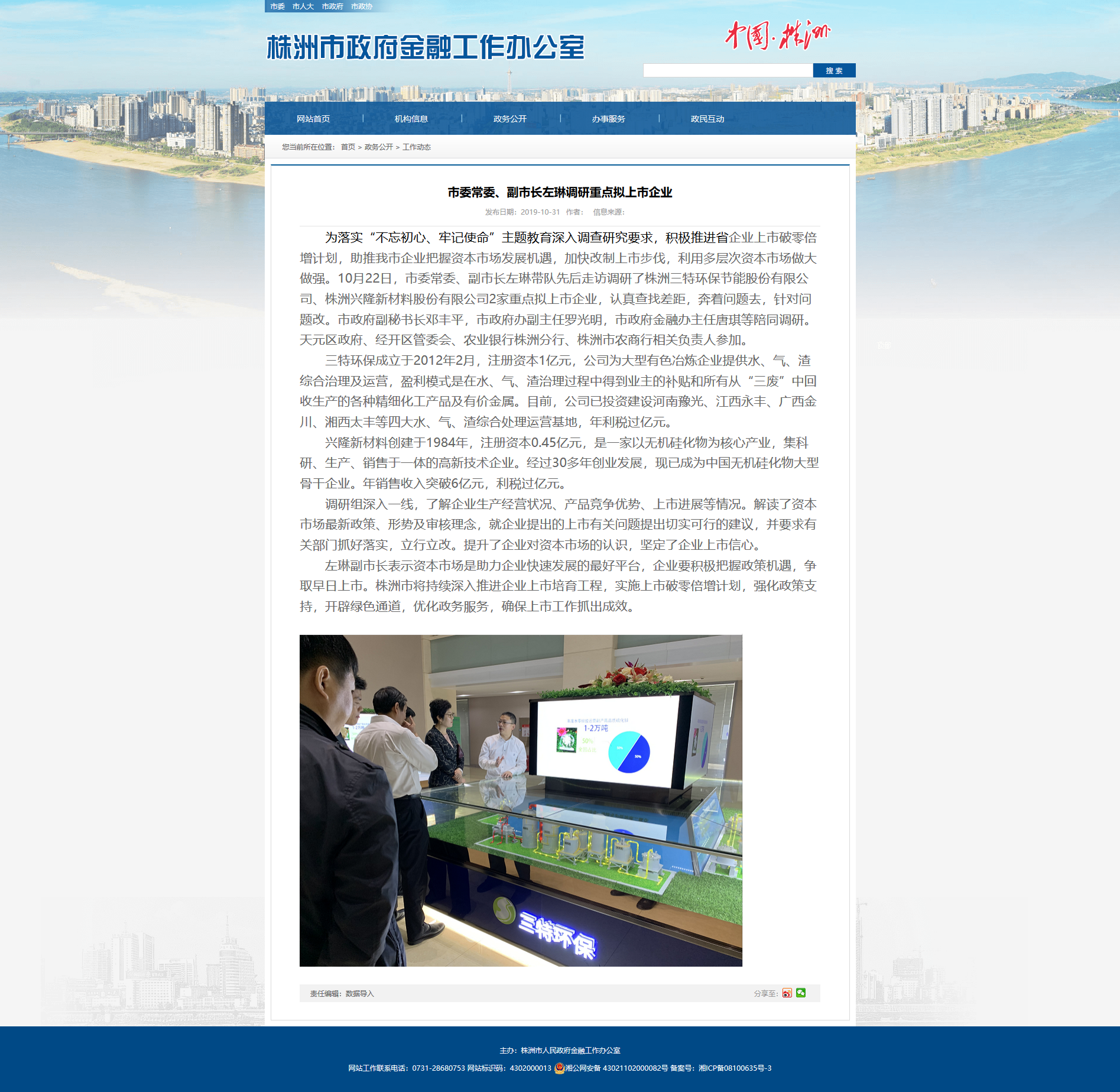 为落实“不忘初心、牢记使命”主题教育深入调查研究要求,积极推进省企业上市破零倍增计划,助推我市企业把握资本市场发展机遇,加快改制上市步伐,利用多层次资本市场做大做强。10月22日,市委常委、副市长左琳带队先后走访调研了株洲三特环保节能股份有限公司、株洲兴隆新材料股份有限公司2家重点拟上市企业,认真查找差距,奔着问题去,针对问题改。市政府副秘书长邓丰平,市政府办副主任罗光明,市政府金融办主任唐琪等陪同调研。天元区政府、经开区管委会、农业银行株洲分行、株洲市农商行相关负责人参加。