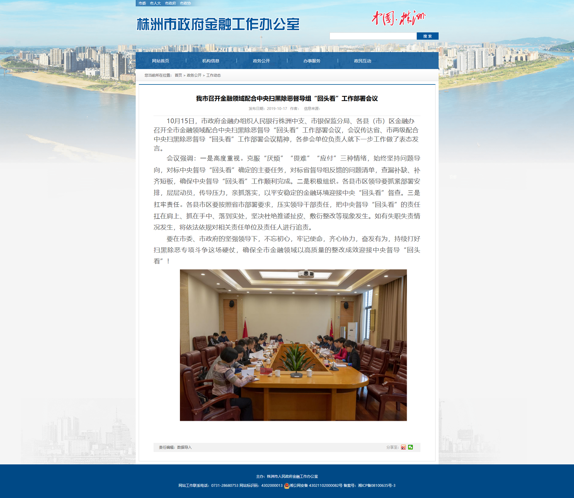 10月15日,市政府金融办组织人民银行株洲中支、市银保监分局、各县(市)区金融办召开全市金融领域配合中央扫黑除恶督导“回头看”工作部署会议,会议传达省、市两级配合中央扫黑除恶督导“回头看”工作部署会议精神,各参会单位负责人就下一步工作做了表态发言。