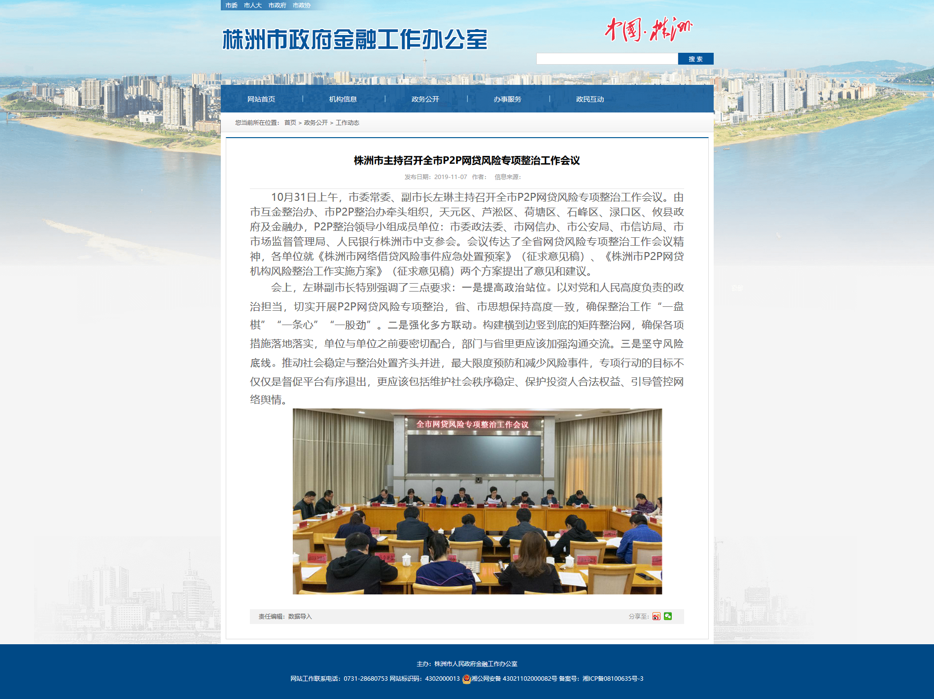 10月31日上午,市委常委、副市长左琳主持召开全市P2P网贷风险专项整治工作会议。由市互金整治办、市P2P整治办牵头组织,天元区、芦淞区、荷塘区、石峰区、渌口区、攸县政府及金融办,P2P整治领导小组成员单位:市委政法委、市网信办、市公安局、市信访局、市市场监督管理局、人民银行株洲市中支参会。会议传达了全省网贷风险专项整治工作会议精神,各单位就《株洲市网络借贷风险事件应急处置预案》(征求意见稿)、《株洲市P2P网贷机构风险整治工作实施方案》(征求意见稿)两个方案提出了意见和建议。