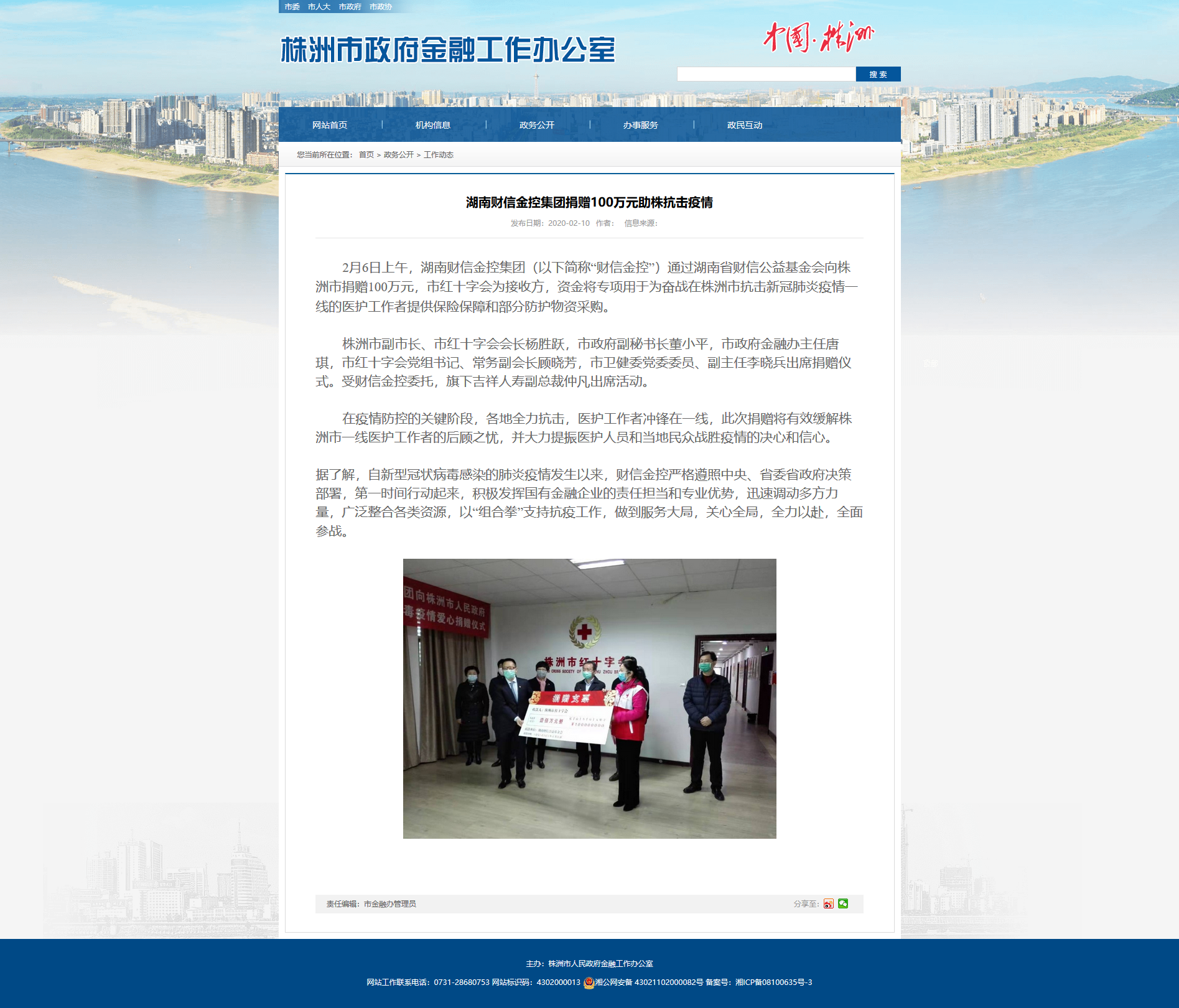 2月6日上午,湖南财信金控集团(以下简称“财信金控”)通过湖南省财信公益基金会向株洲市捐赠100万元,市红十字会为接收方,资金将专项用于为奋战在株洲市抗击新冠肺炎疫情一线的医护工作者提供保险保障和部分防护物资采购。