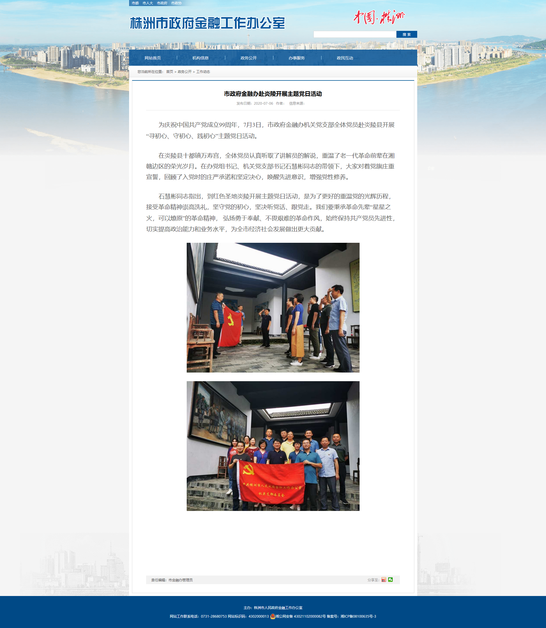 为庆祝中国共产党成立99周年,7月3日,市政府金融办机关党支部全体党员赴炎陵县开展“寻初心、守初心、践初心”主题党日活动。