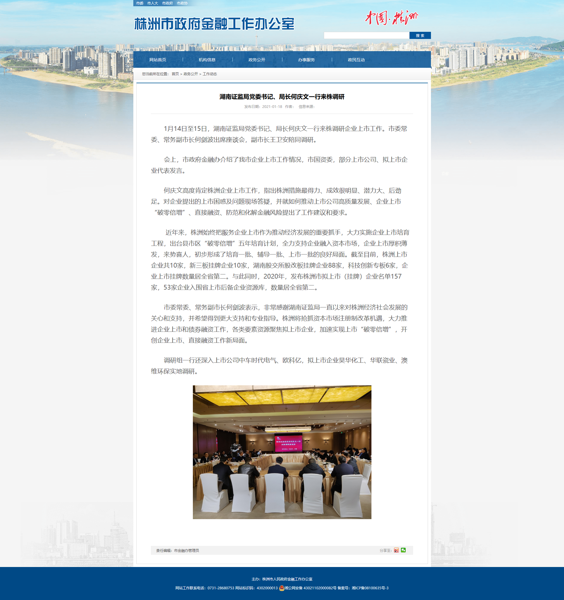 1月14日至15日,湖南证监局党委书记、局长何庆文一行来株调研企业上市工作。市委常委、常务副市长何剑波出席座谈会,副市长王卫安陪同调研。