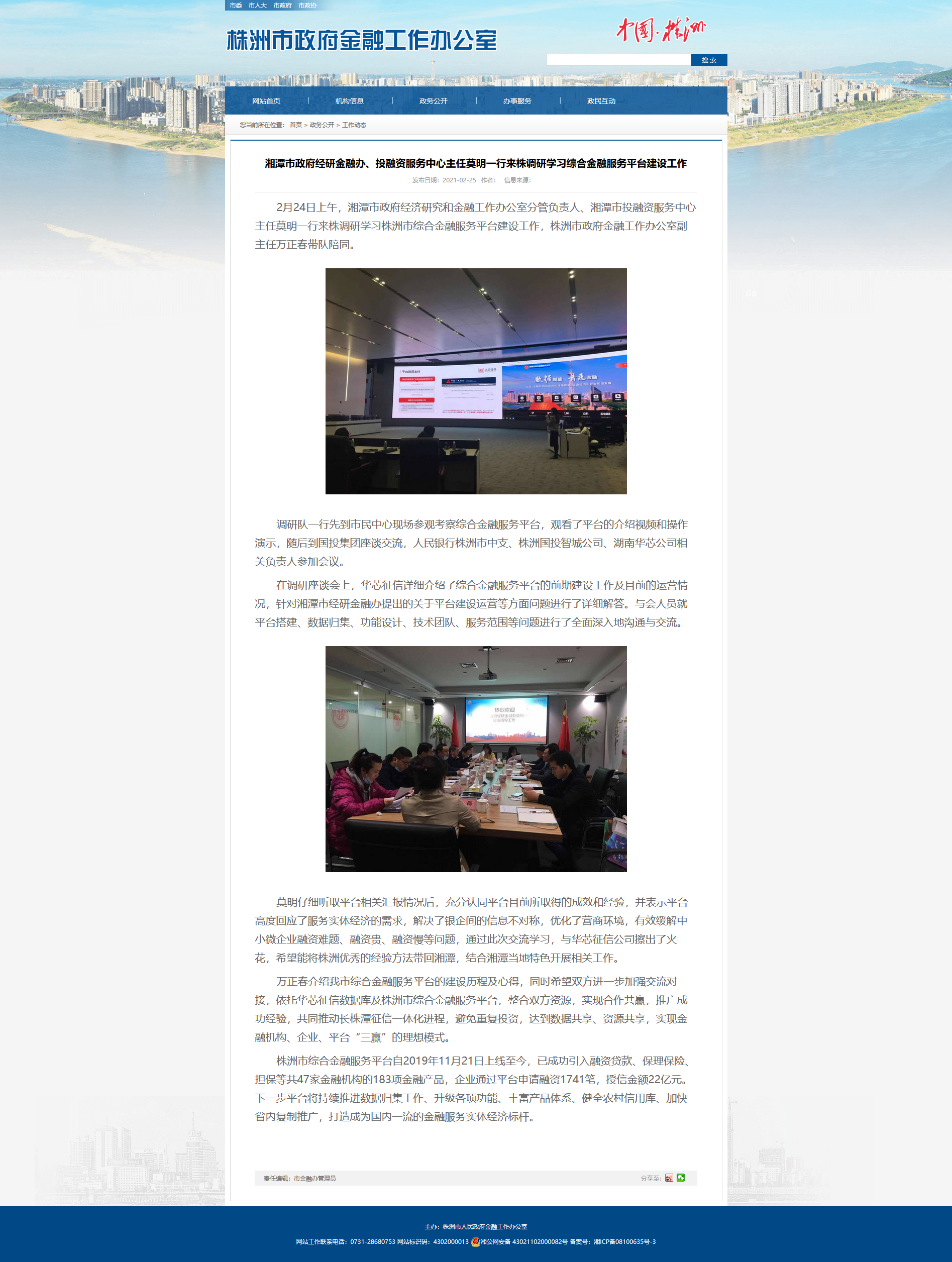 万正春介绍我市综合金融服务平台的建设历程及心得,同时希望双方进一步加强交流对接,依托华芯征信数据库及株洲市综合金融服务平台,整合双方资源,实现合作共赢,推广成功经验,共同推动长株潭征信一体化进程,避免重复投资,达到数据共享、资源共享,实现金融机构、企业、平台“三赢”的理想模式。