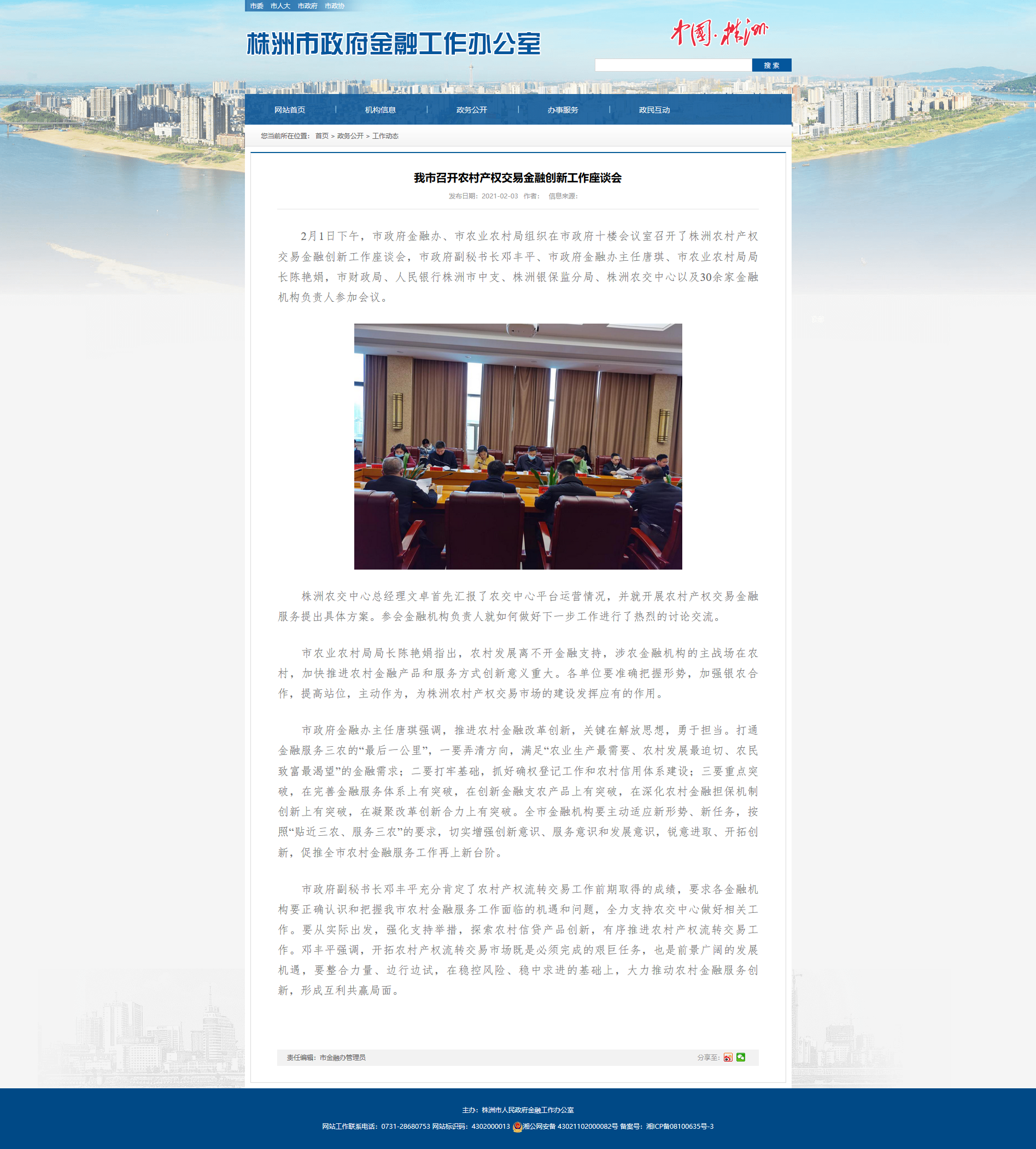 2月1日下午,市政府金融办、市农业农村局组织在市政府十楼会议室召开了株洲农村产权交易金融创新工作座谈会,市政府副秘书长邓丰平、市政府金融办主任唐琪、市农业农村局局长陈艳娟,市财政局、人民银行株洲市中支、株洲银保监分局、株洲农交中心以及30余家金融机构负责人参加会议。