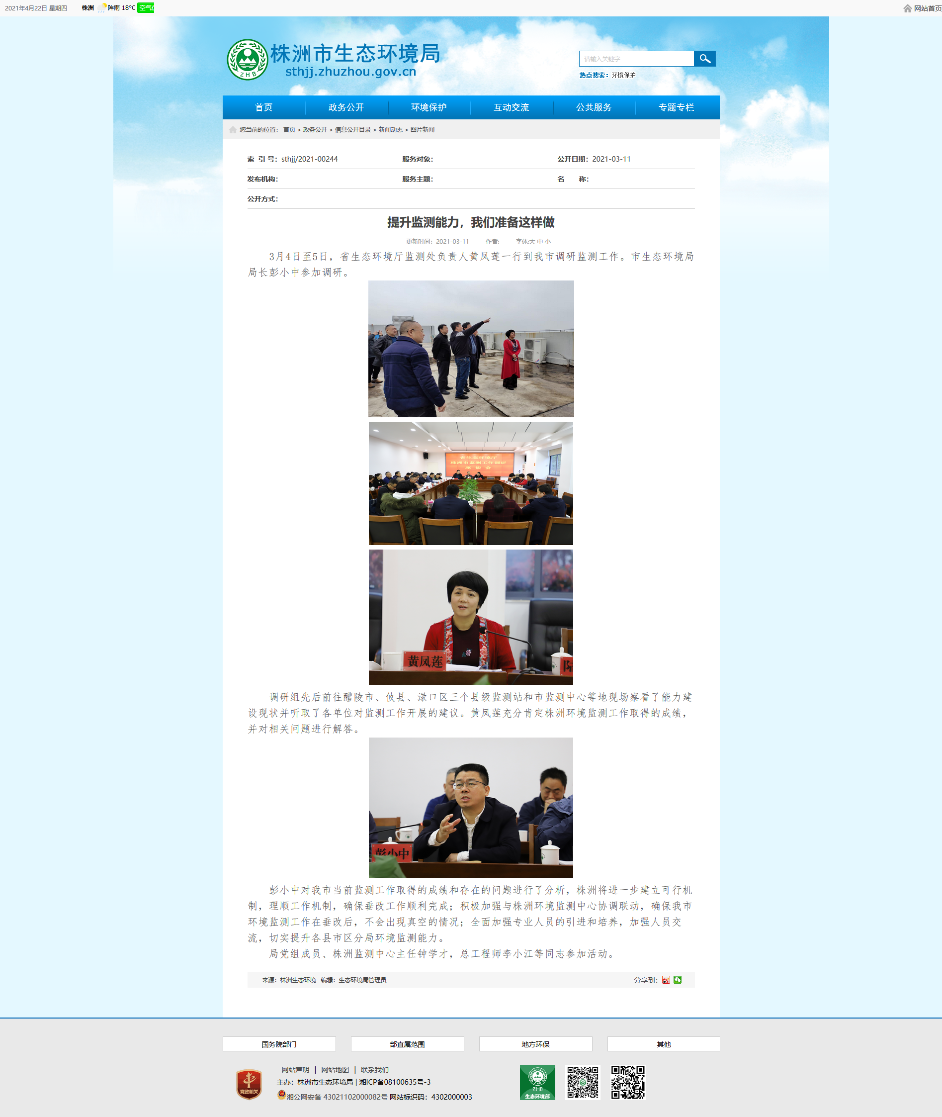 3月4日至5日,省生态环境厅监测处负责人黄凤莲一行到我市调研监测工作。市生态环境局局长彭小中参加调研。