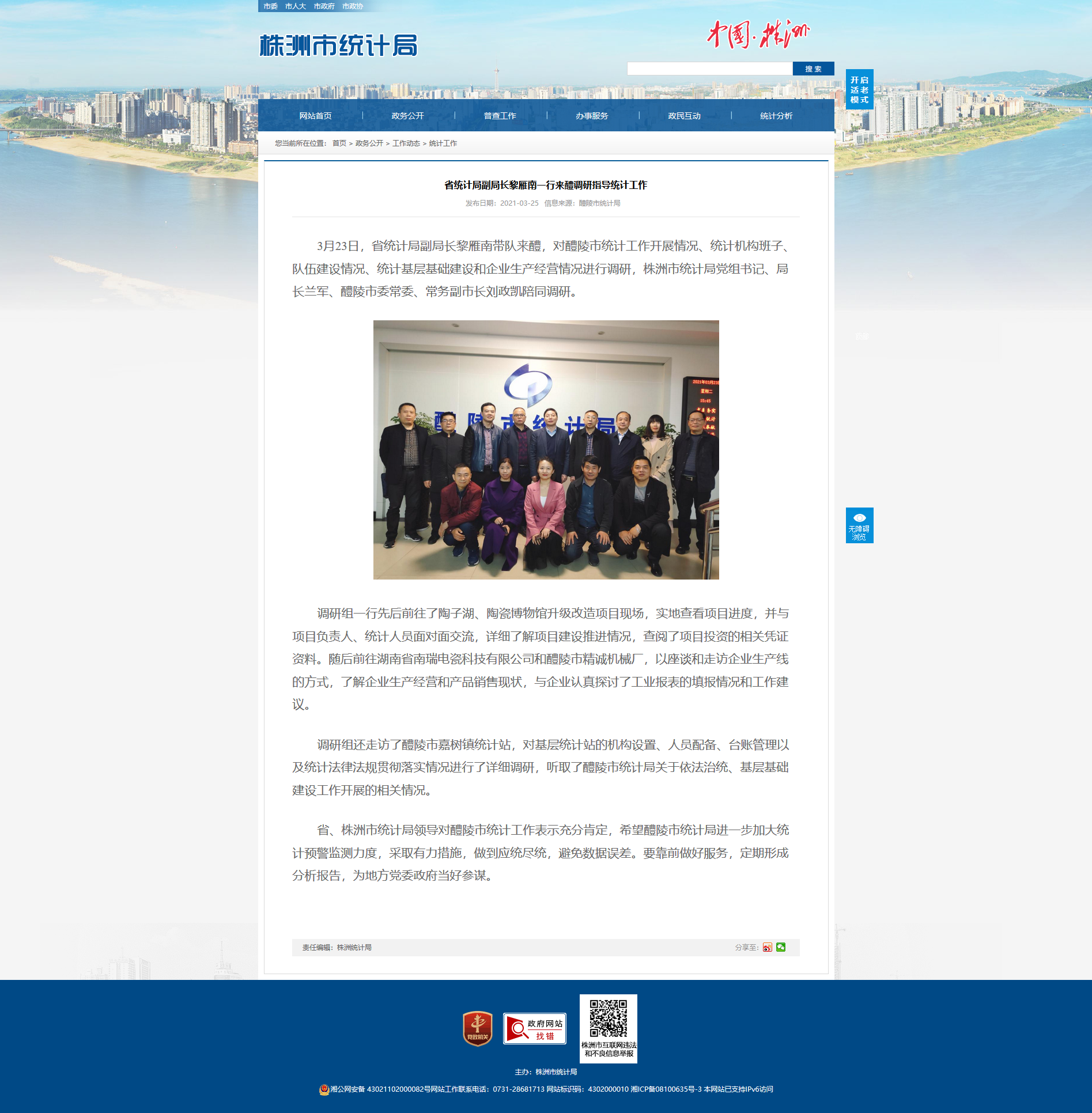 3月23日,省统计局副局长黎雁南带队来醴,对醴陵市统计工作开展情况、统计机构班子、队伍建设情况、统计基层基础建设和企业生产经营情况进行调研,株洲市统计局党组书记、局长兰军、醴陵市委常委、常务副市长刘政凯陪同调研。