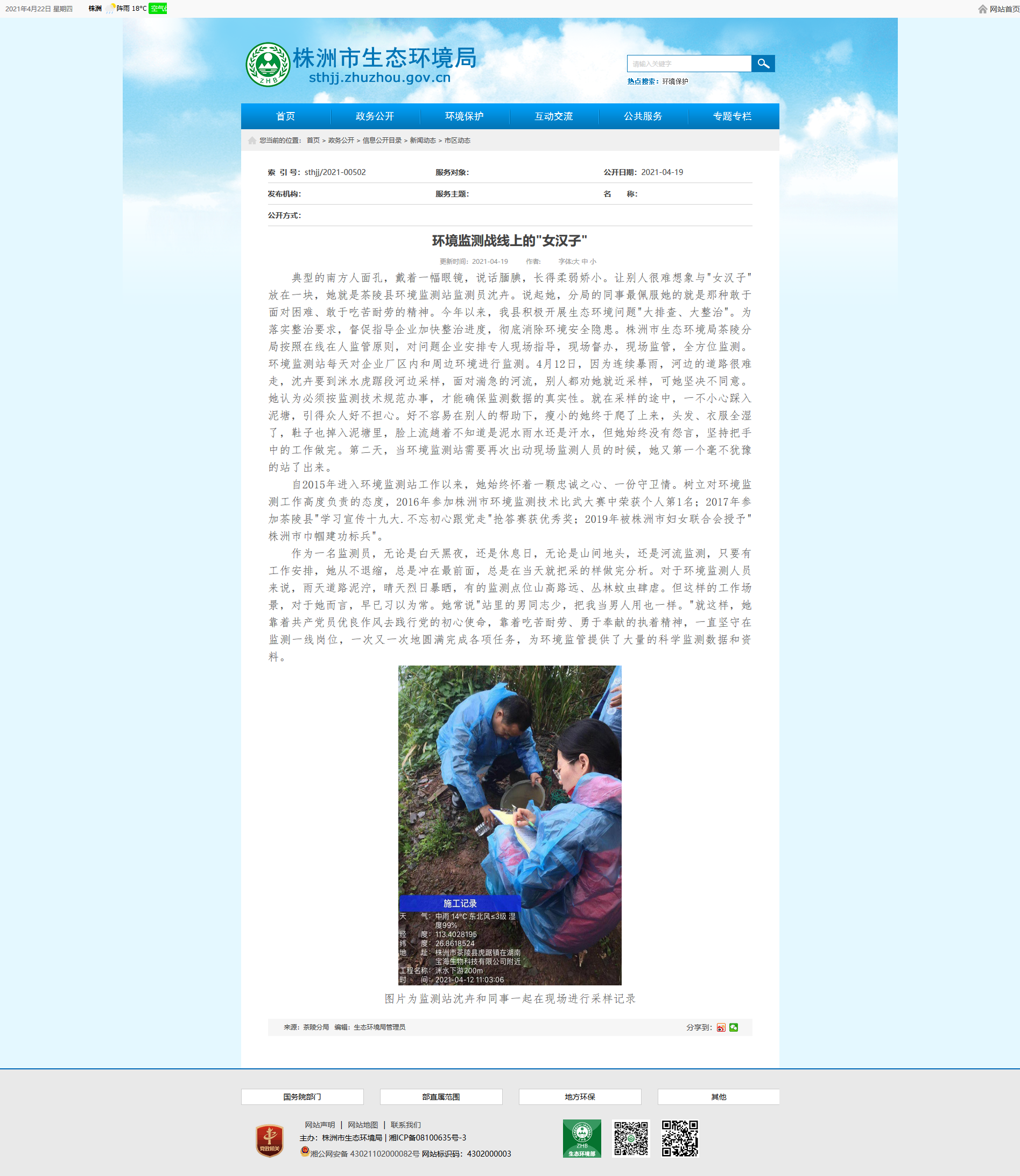 典型的南方人面孔,戴着一幅眼镜,说话腼腆,长得柔弱娇小。让别人很难想象与"女汉子"放在一块,她就是茶陵县环境监测站监测员沈卉。说起她,分局的同事最佩服她的就是那种敢于面对困难、敢于吃苦耐劳的精神。今年以来,我县积极开展生态环境问题"大排查、大整治"。为落实整治要求,督促指导企业加快整治进度,彻底消除环境安全隐患。株洲市生态环境局茶陵分局按照在线在人监管原则,对问题企业安排专人现场指导,现场督办,现场监管,全方位监测。环境监测站每天对企业厂区内和周边环境进行监测。4月12日,因为连续暴雨,河边的道路很难走,沈卉要到洣水虎踞段河边采样,面对湍急的河流,别人都劝她就近采样,可她坚决不同意。她认为必须按监测技术规范办事,才能确保监测数据的真实性。就在采样的途中,一不小心踩入泥塘,引得众人好不担心。好不容易在别人的帮助下,瘦小的她终于爬了上来,头发、衣服全湿了,靯子也掉入泥塘里,脸上流趟着不知道是泥水雨水还是汗水,但她始终没有怨言,坚持把手中的工作做完。第二天,当环境监测站需要再次出动现场监测人员的时候,她又第一个毫不犹豫的站了出来。