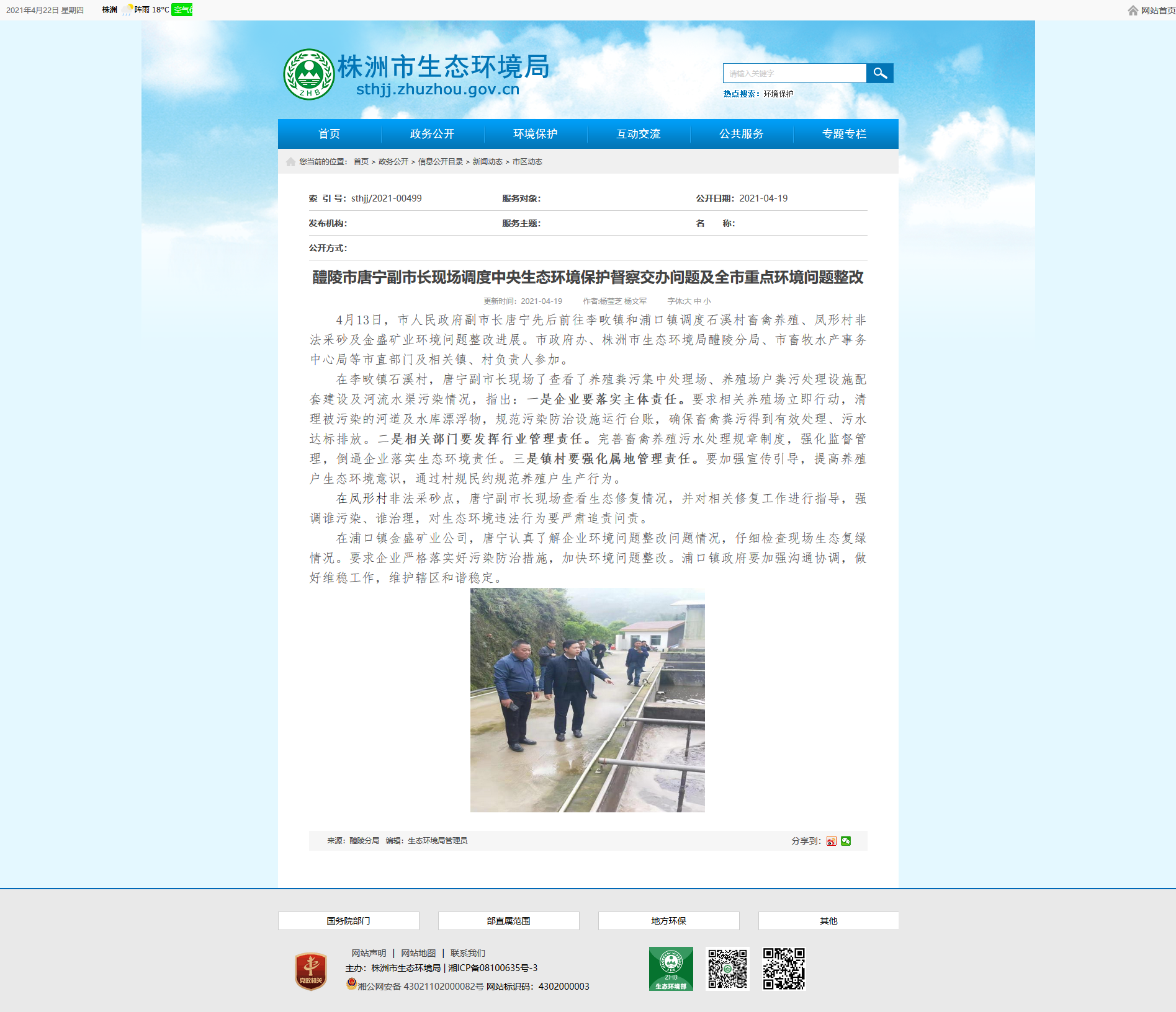 4月13日,市人民政府副市长唐宁先后前往李畋镇和浦口镇调度石溪村畜禽养殖、凤形村非法采砂及金盛矿业环境问题整改进展。市政府办、株洲市生态环境局醴陵分局、市畜牧水产事务中心局等市直部门及相关镇、村负责人参加。