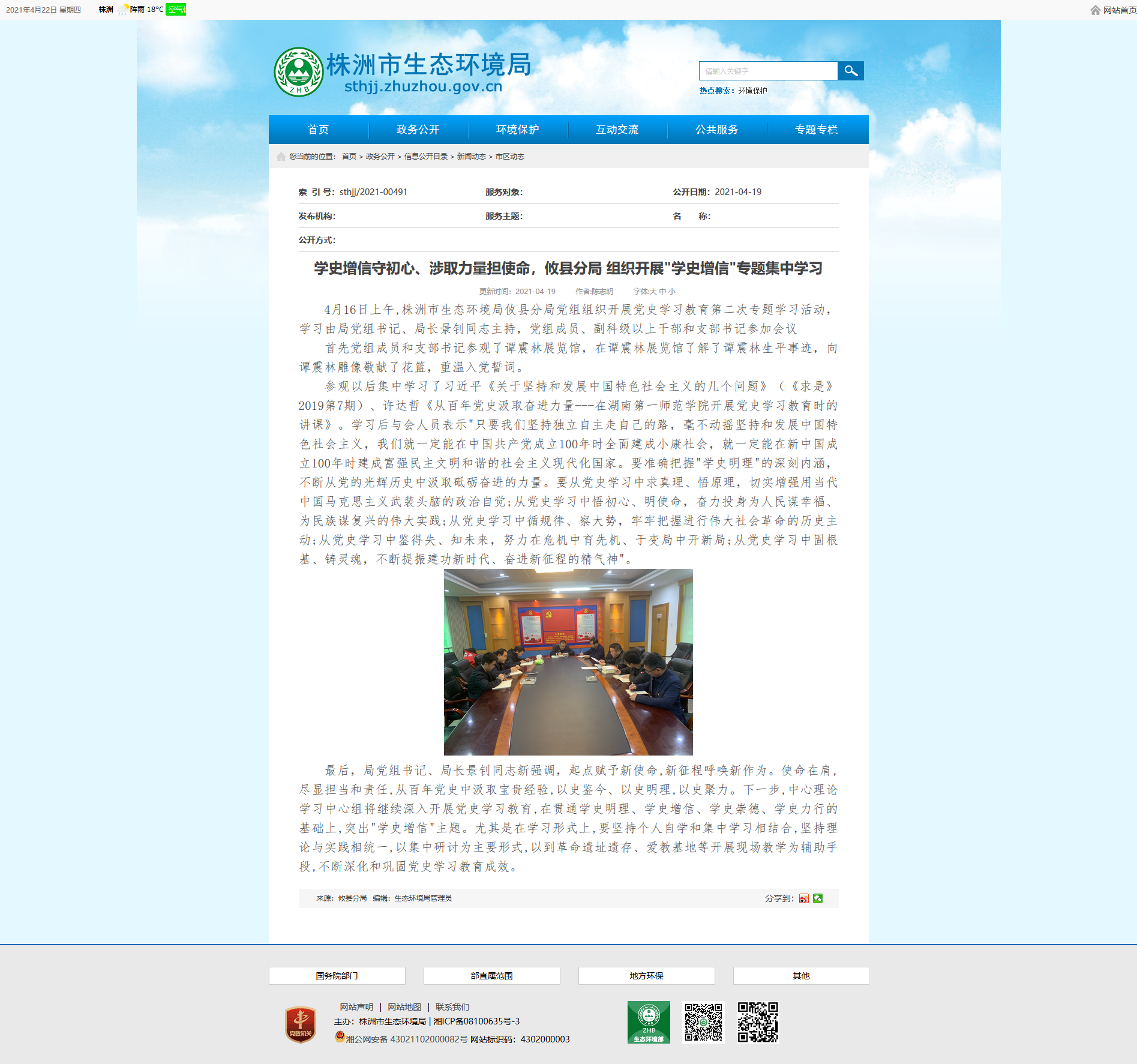 4月16日上午,株洲市生态环境局攸县分局党组组织开展党史学习教育第二次专题学习活动,学习由局党组书记、局长景钊同志主持,党组成员、副科级以上干部和支部书记参加会议