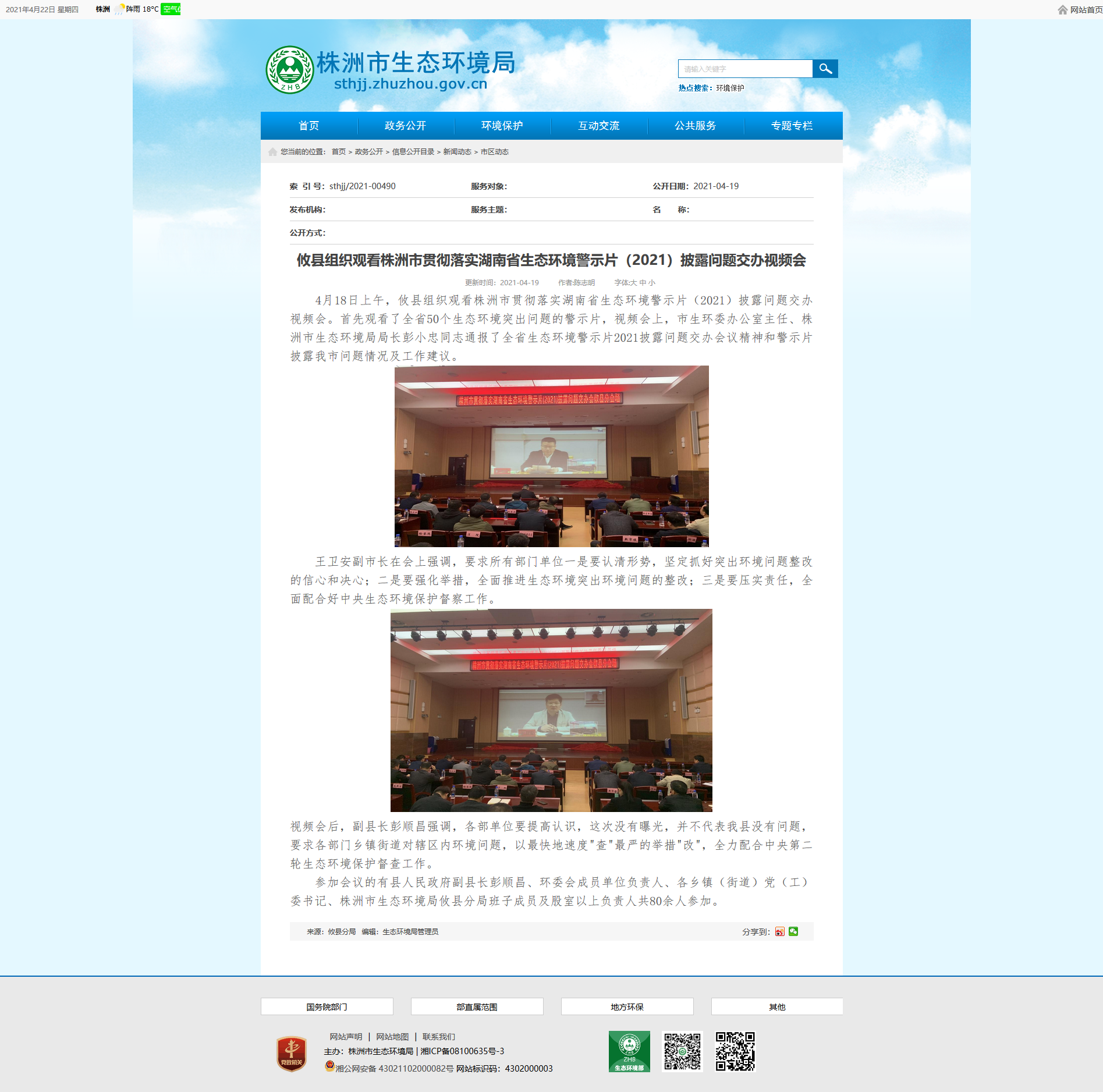 4月18日上午,攸县组织观看株洲市贯彻落实湖南省生态环境警示片(2021)披露问题交办视频会。首先观看了全省50个生态环境突出问题的警示片,视频会上,市生环委办公室主任、株洲市生态环境局局长彭小忠同志通报了全省生态环境警示片2021披露问题交办会议精神和警示片披露我市问题情况及工作建议。