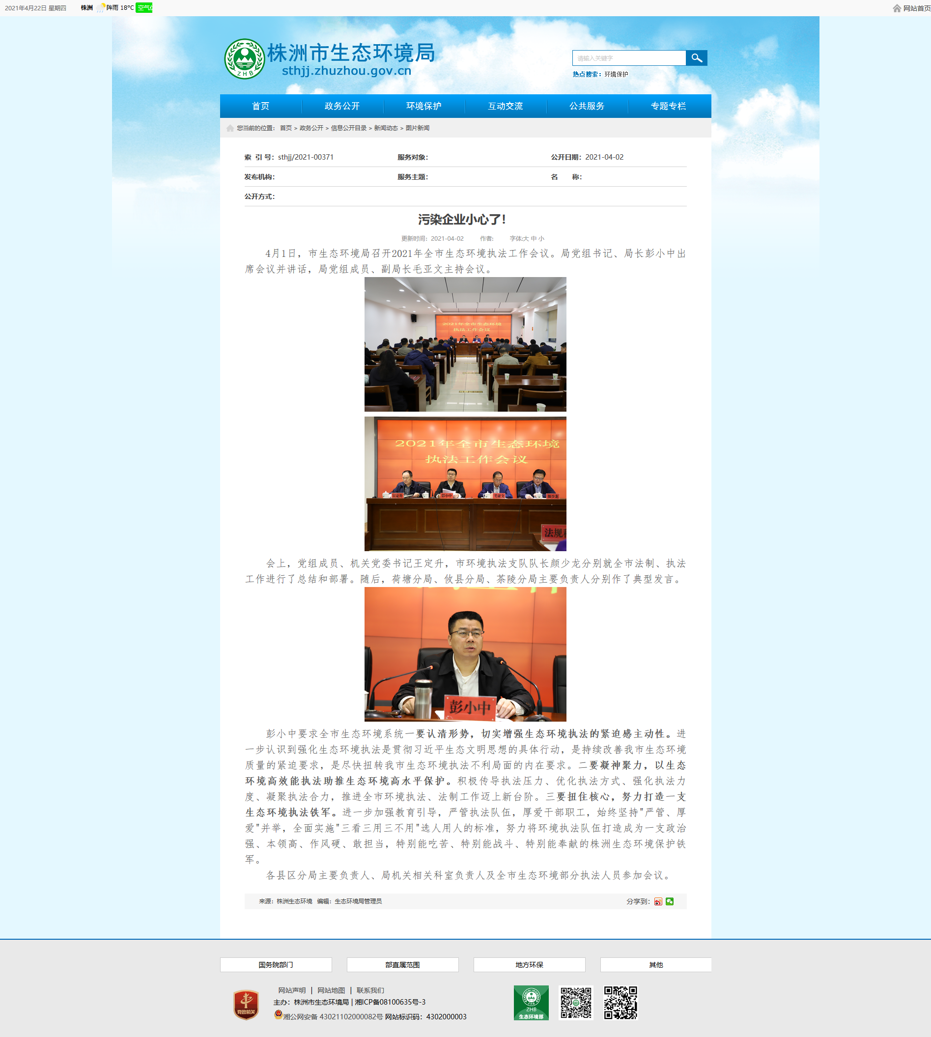 4月1日,市生态环境局召开2021年全市生态环境执法工作会议。局党组书记、局长彭小中出席会议并讲话,局党组成员、副局长毛亚文主持会议。