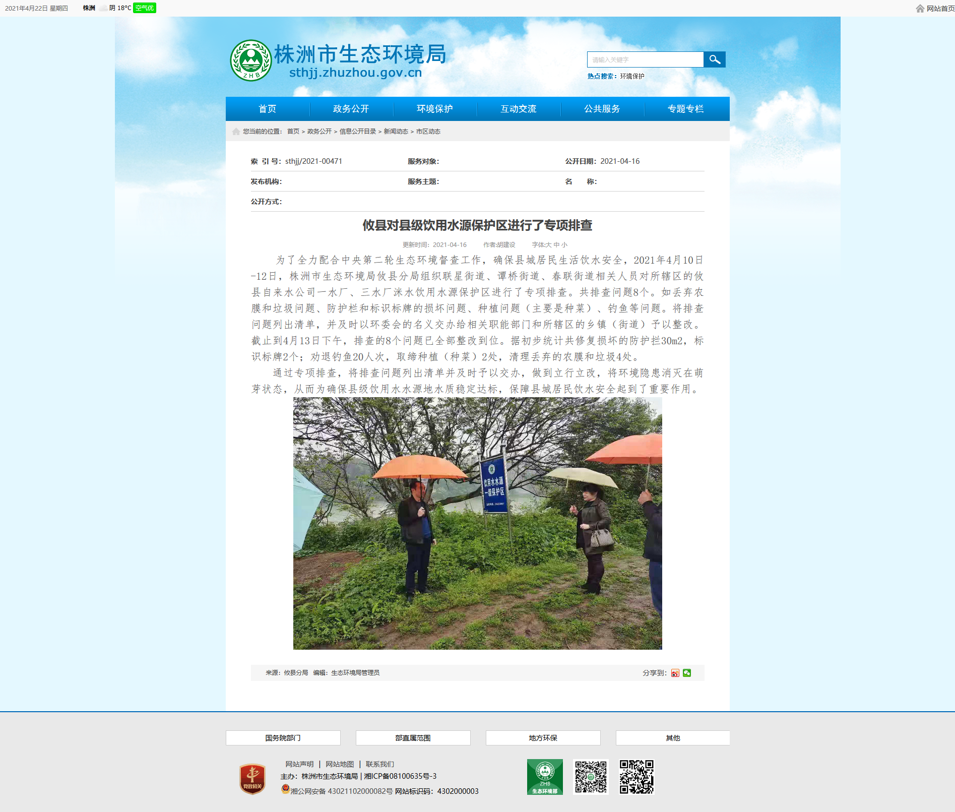 为了全力配合中央第二轮生态环境督查工作,确保县城居民生活饮水安全,2021年4月10日-12日,株洲市生态环境局攸县分局组织联星街道、谭桥街道、春联街道相关人员对所辖区的攸县自来水公司一水厂、三水厂洣水饮用水源保护区进行了专项排查。共排查问题8个。如丢弃农膜和垃圾问题、防护栏和标识标牌的损坏问题、种植问题(主要是种菜)、钓鱼等问题。将排查问题列出清单,并及时以环委会的名义交办给相关职能部门和所辖区的乡镇(街道)予以整改。截止到4月13日下午,排查的8个问题已全部整改到位。据初步统计共修复损坏的防护拦30m2,标识标牌2个;劝退钓鱼20人次,取缔种植(种菜)2处,清理丢弃的农膜和垃圾4处。