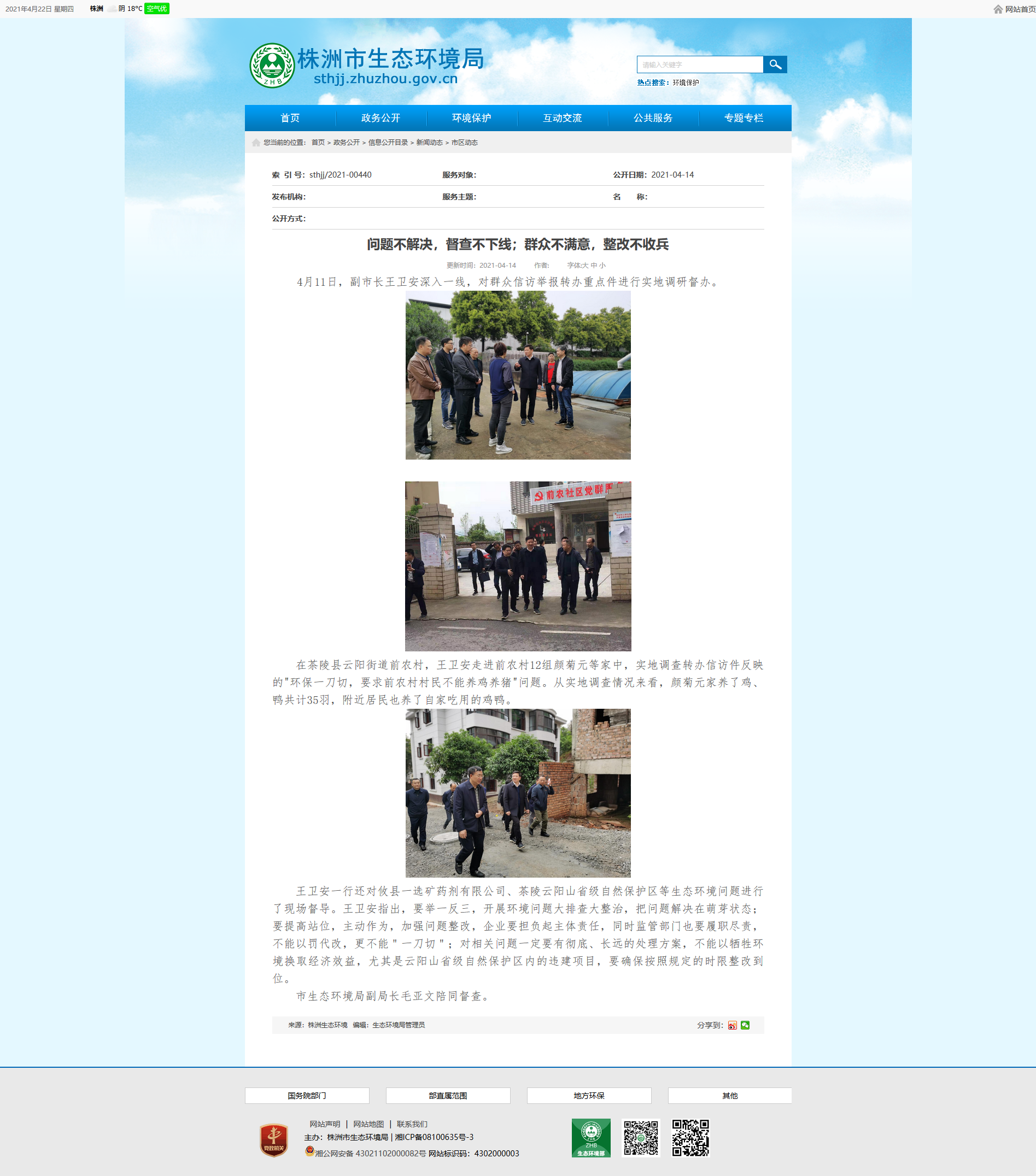 王卫安一行还对攸县一选矿药剂有限公司、茶陵云阳山省级自然保护区等生态环境问题进行了现场督导。王卫安指出,要举一反三,开展环境问题大排查大整治,把问题解决在萌芽状态;要提高站位,主动作为,加强问题整改,企业要担负起主体责任,同时监管部门也要履职尽责,不能以罚代改,更不能"一刀切";对相关问题一定要有彻底、长远的处理方案,不能以牺牲环境换取经济效益,尤其是云阳山省级自然保护区内的违建项目,要确保按照规定的时限整改到位。