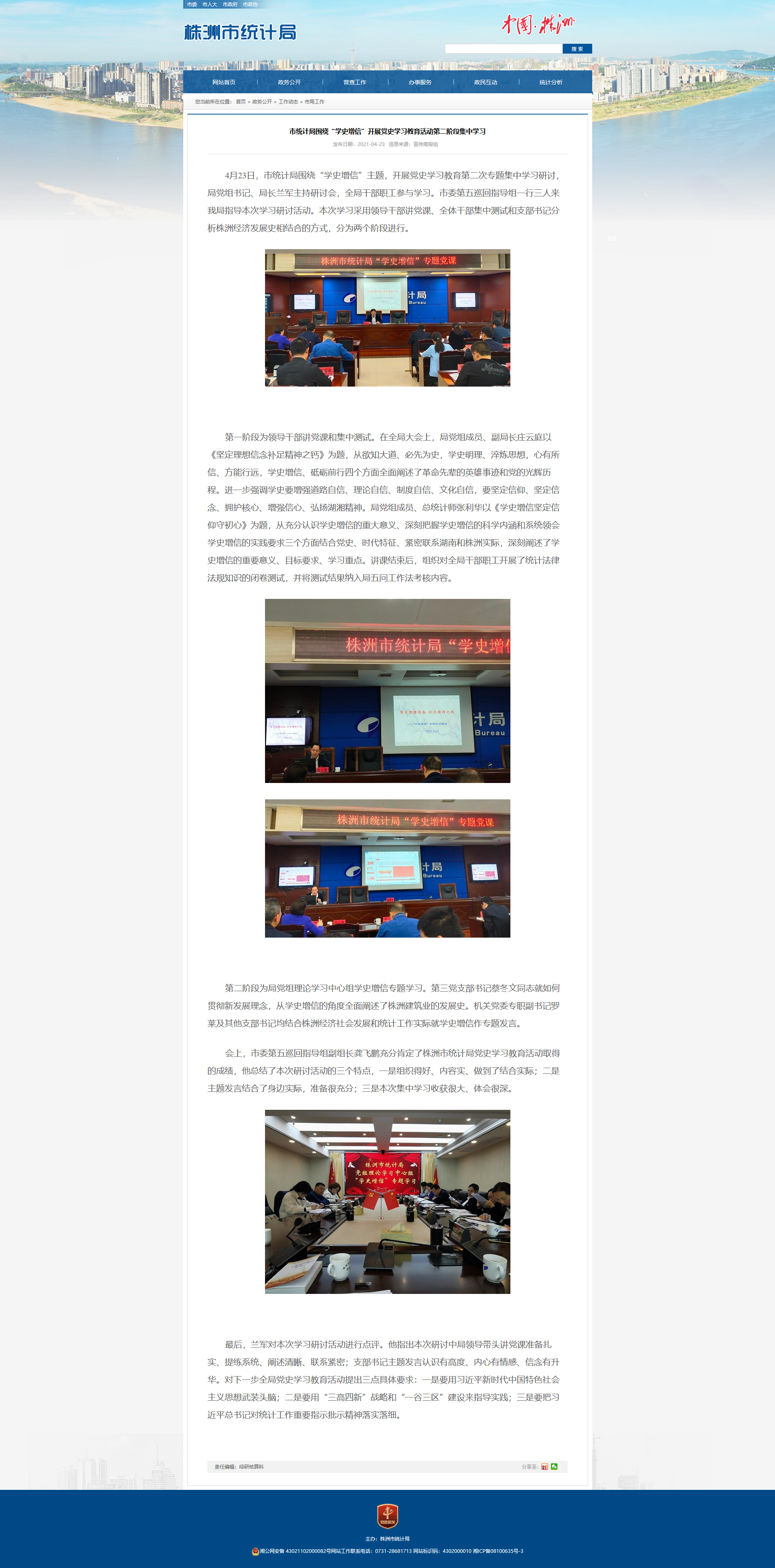 4月23日,市统计局围绕“学史增信”主题,开展党史学习教育第二次专题集中学习研讨,局党组书记、局长兰军主持研讨会,全局干部职工参与学习。市委第五巡回指导组一行三人来我局指导本次学习研讨活动。本次学习采用领导干部讲党课、全体干部集中测试和支部书记分析株洲经济发展史相结合的方式,分为两个阶段进行。