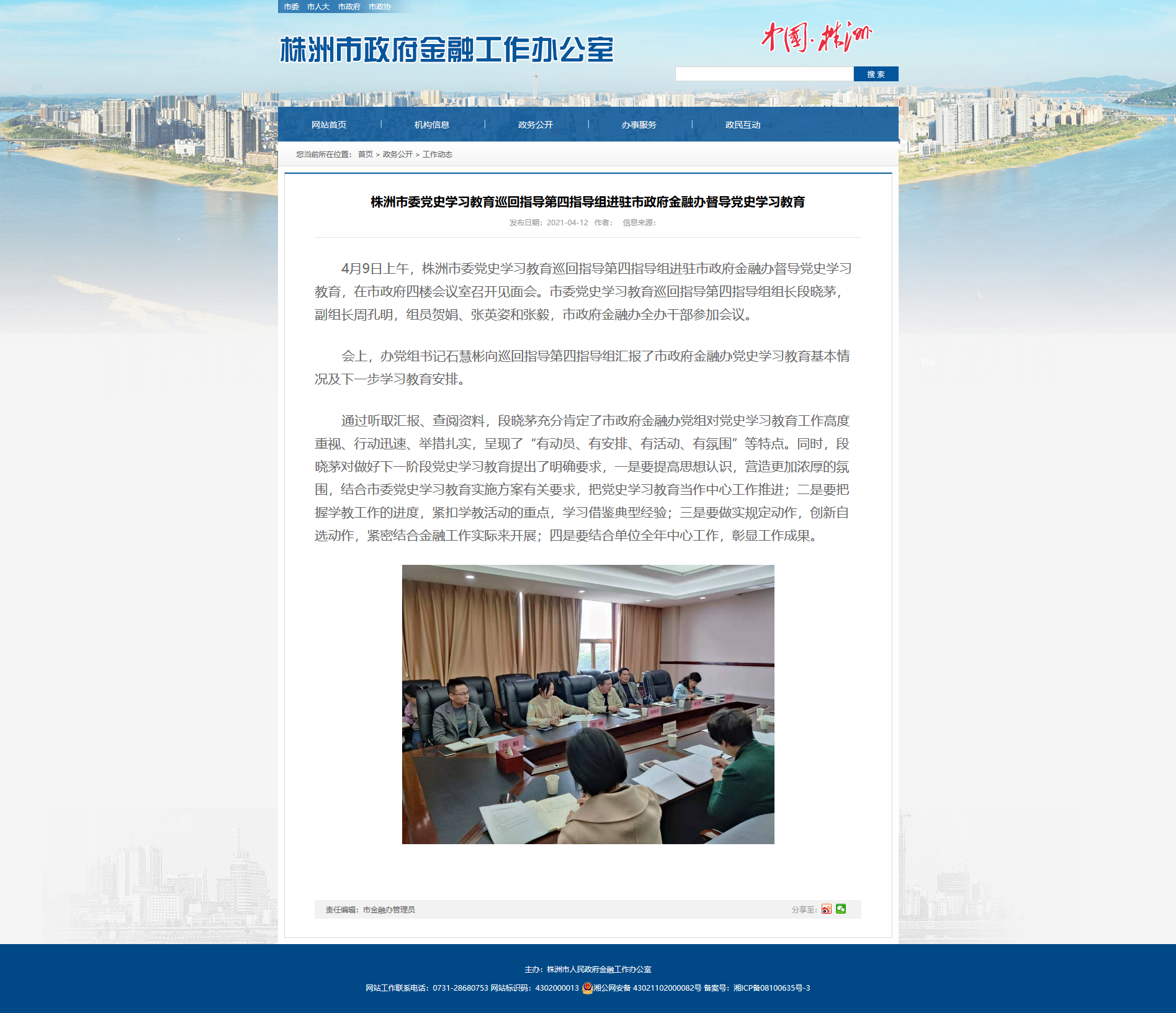 4月9日上午,株洲市委党史学习教育巡回指导第四指导组进驻市政府金融办督导党史学习教育,在市政府四楼会议室召开见面会。市委党史学习教育巡回指导第四指导组组长段晓茅,副组长周孔明,组员贺娟、张英姿和张毅,市政府金融办全办干部参加会议。