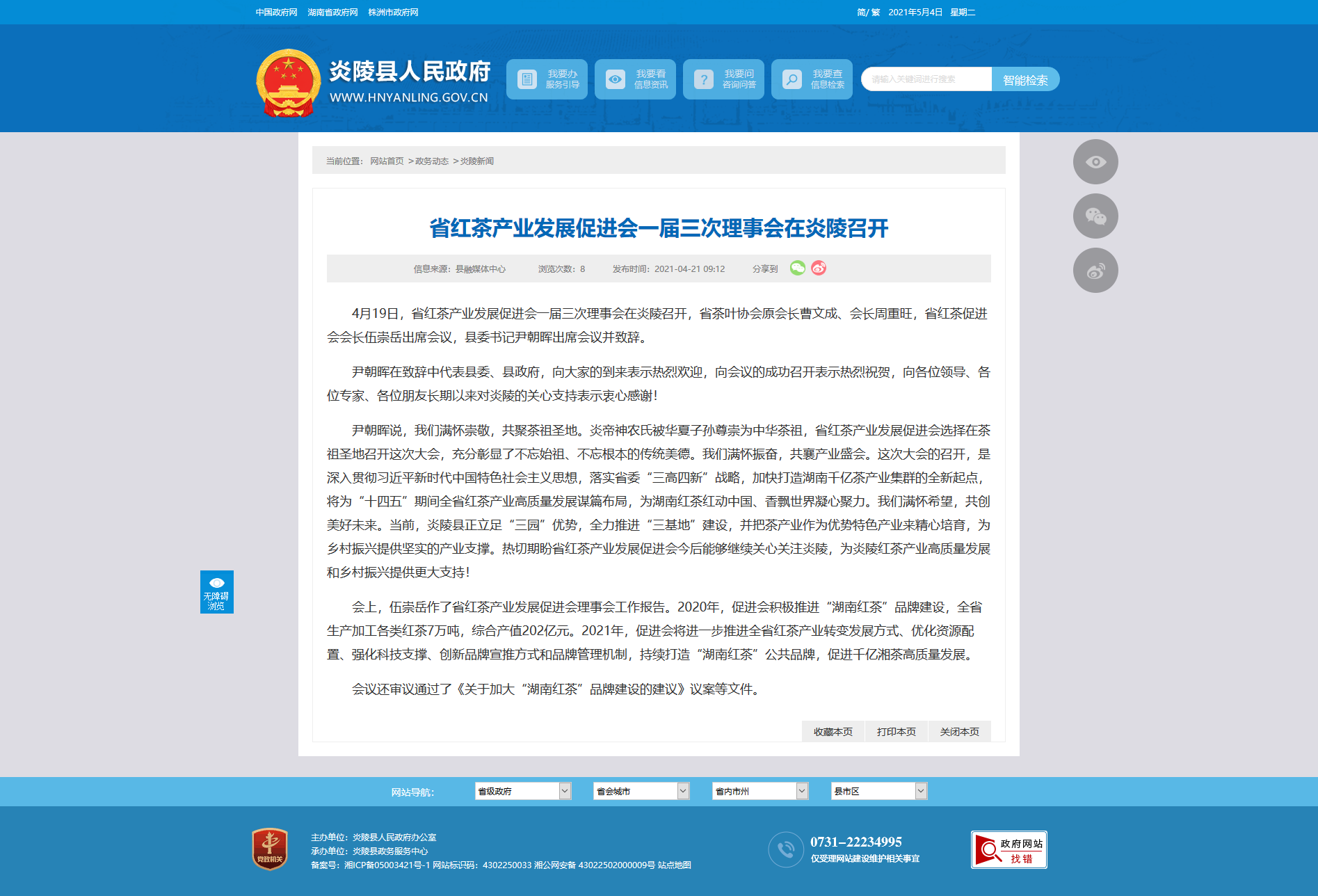 4月19日,省红茶产业发展促进会一届三次理事会在炎陵召开,省茶叶协会原会长曹文成、会长周重旺,省红茶促进会会长伍崇岳出席会议,县委书记尹朝晖出席会议并致辞。