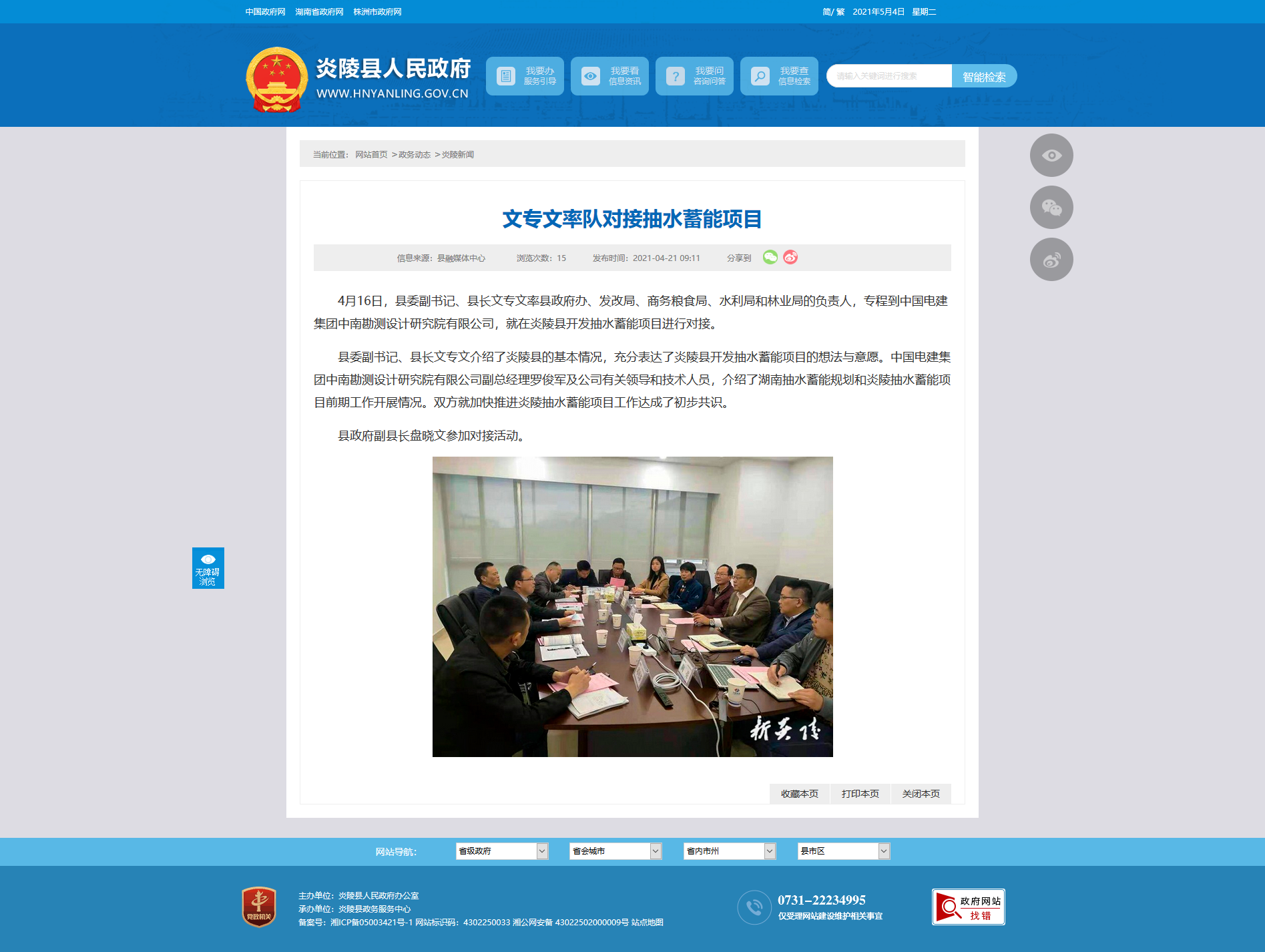 4月16日,县委副书记、县长文专文率县政府办、发改局、商务粮食局、水利局和林业局的负责人,专程到中国电建集团中南勘测设计研究院有限公司,就在炎陵县开发抽水蓄能项目进行对接。