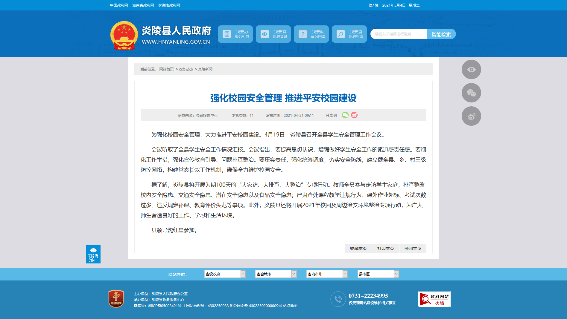 据了解,炎陵县将开展为期100天的“大家访、大排查、大整治”专项行动。教师全员参与走访学生家庭;排查整改校内安全隐患、交通安全隐患、潜在安全隐患以及食品安全隐患;严肃查处课程教学违规行为、课外作业超标、考试次数过多、违反规定补课、教育评价失范等事项。此外,炎陵县还将开展2021年校园及周边治安环境整治专项行动,为广大师生营造良好的工作、学习和生活环境。