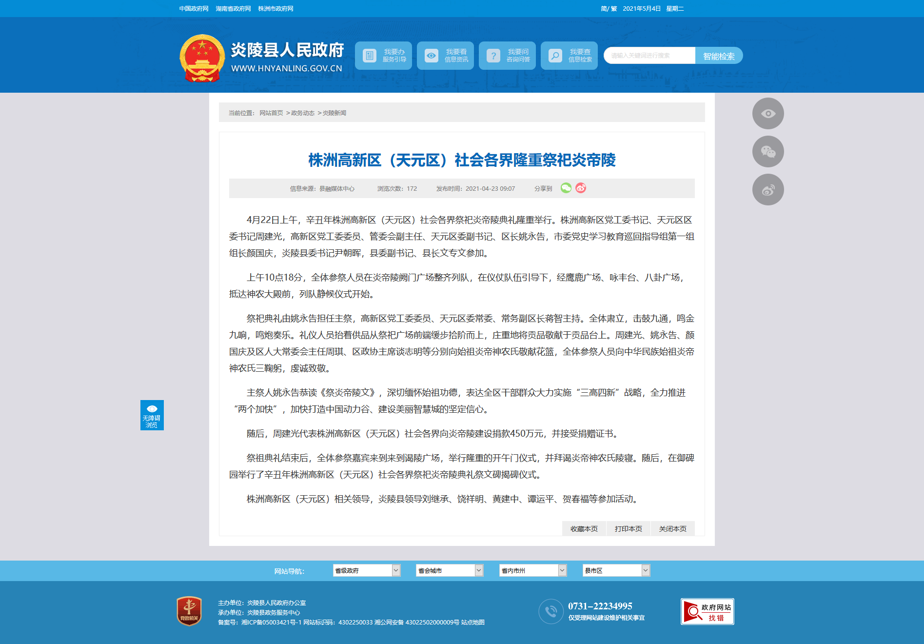 4月22日上午,辛丑年株洲高新区(天元区)社会各界祭祀炎帝陵典礼隆重举行。株洲高新区党工委书记、天元区区委书记周建光,高新区党工委委员、管委会副主任、天元区委副书记、区长姚永告,市委党史学习教育巡回指导组第一组组长颜国庆,炎陵县委书记尹朝晖,县委副书记、县长文专文参加。