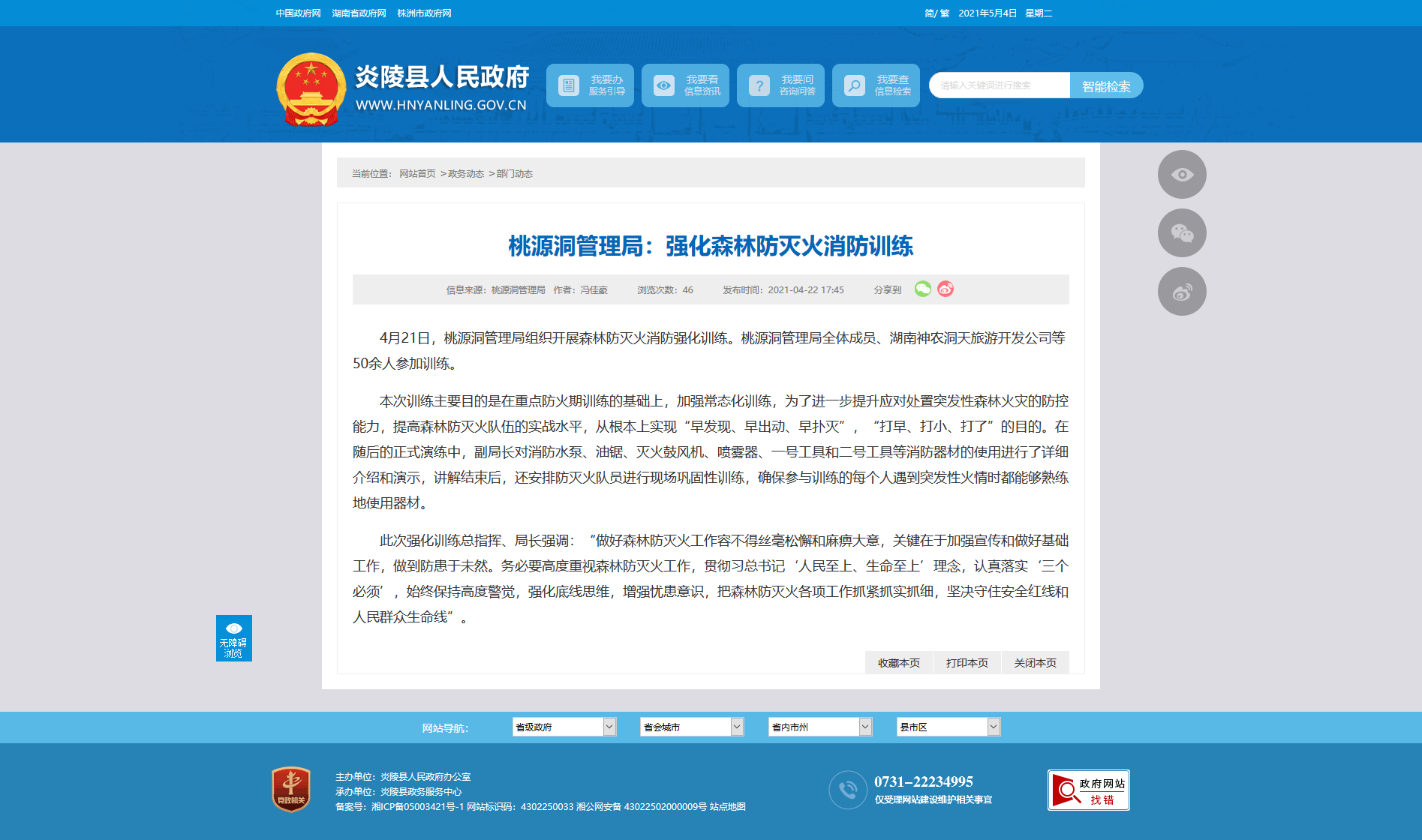 4月21日,桃源洞管理局组织开展森林防灭火消防强化训练。桃源洞管理局全体成员、湖南神农洞天旅游开发公司等50余人参加训练。