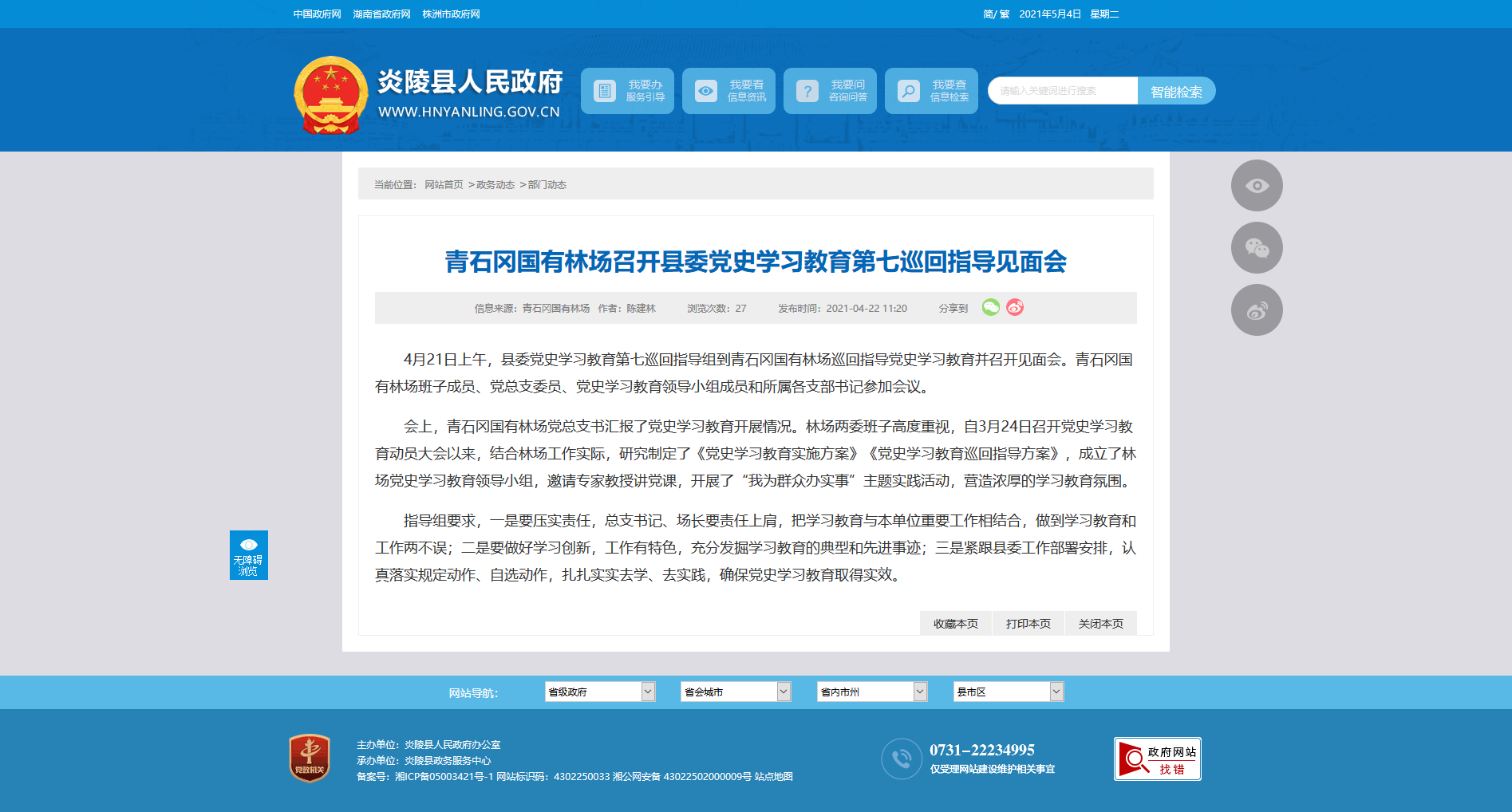 4月21日上午,县委党史学习教育第七巡回指导组到青石冈国有林场巡回指导党史学习教育并召开见面会。青石冈国有林场班子成员、党总支委员、党史学习教育领导小组成员和所属各支部书记参加会议。