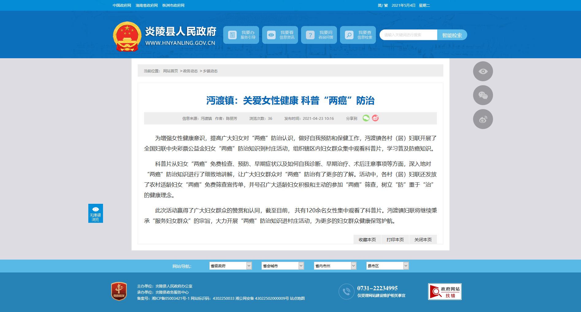 科普片从妇女“两癌”免费检查、预防、早期症状以及如何自我诊断、早期治疗、术后注意事项等方面,深入地对“两癌”防治知识进行了细致地讲解,让广大妇女群众对“两癌”防治有了更多的了解。活动中,各村(居)妇联还发放了农村适龄妇女“两癌”免费筛查宣传单,并号召广大适龄妇女积极和主动的参加“两癌”筛查,树立“防”重于“治”的健康理念。