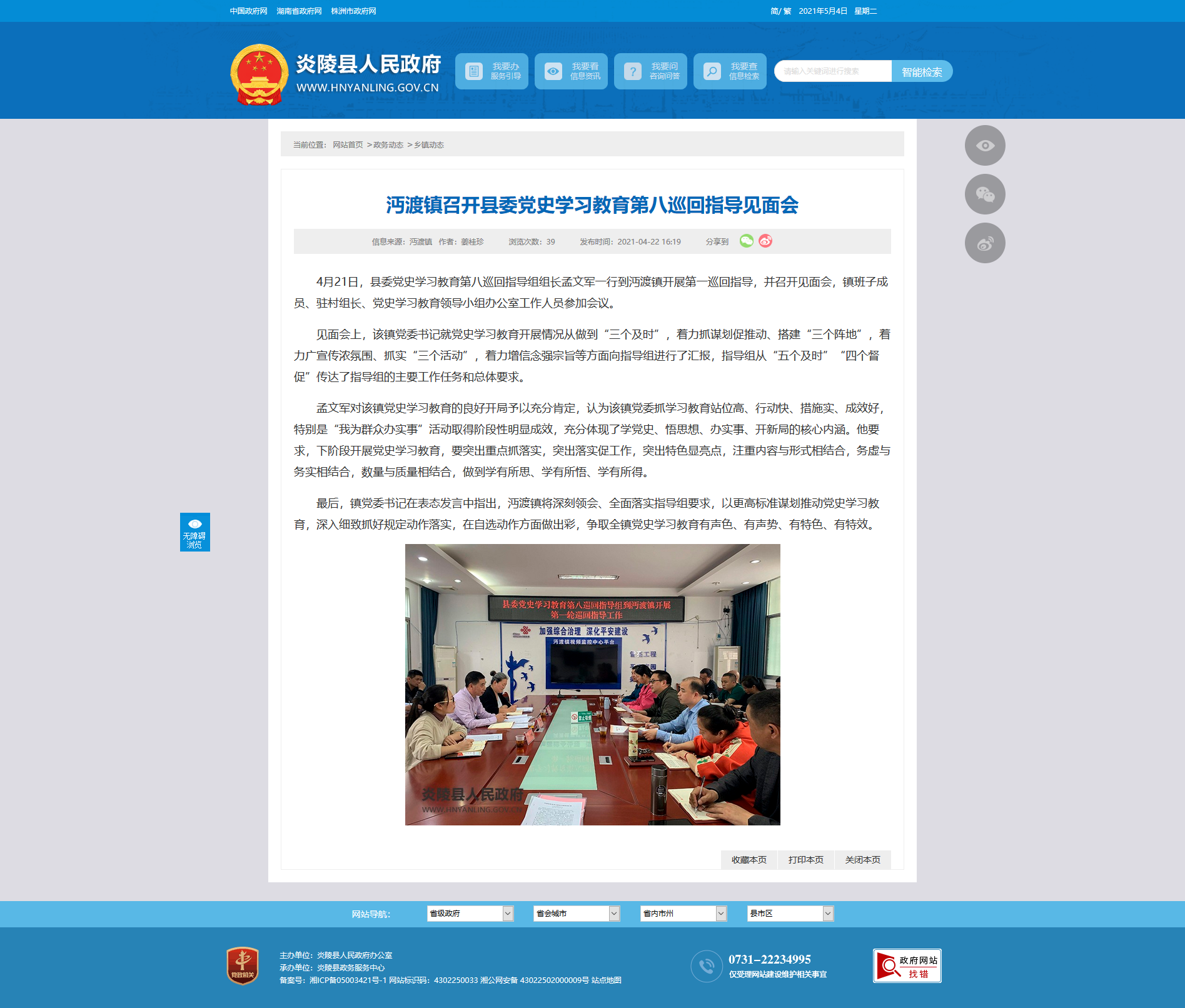 4月21日,县委党史学习教育第八巡回指导组组长孟文军一行到沔渡镇开展第一巡回指导,并召开见面会,镇班子成员、驻村组长、党史学习教育领导小组办公室工作人员参加会议。