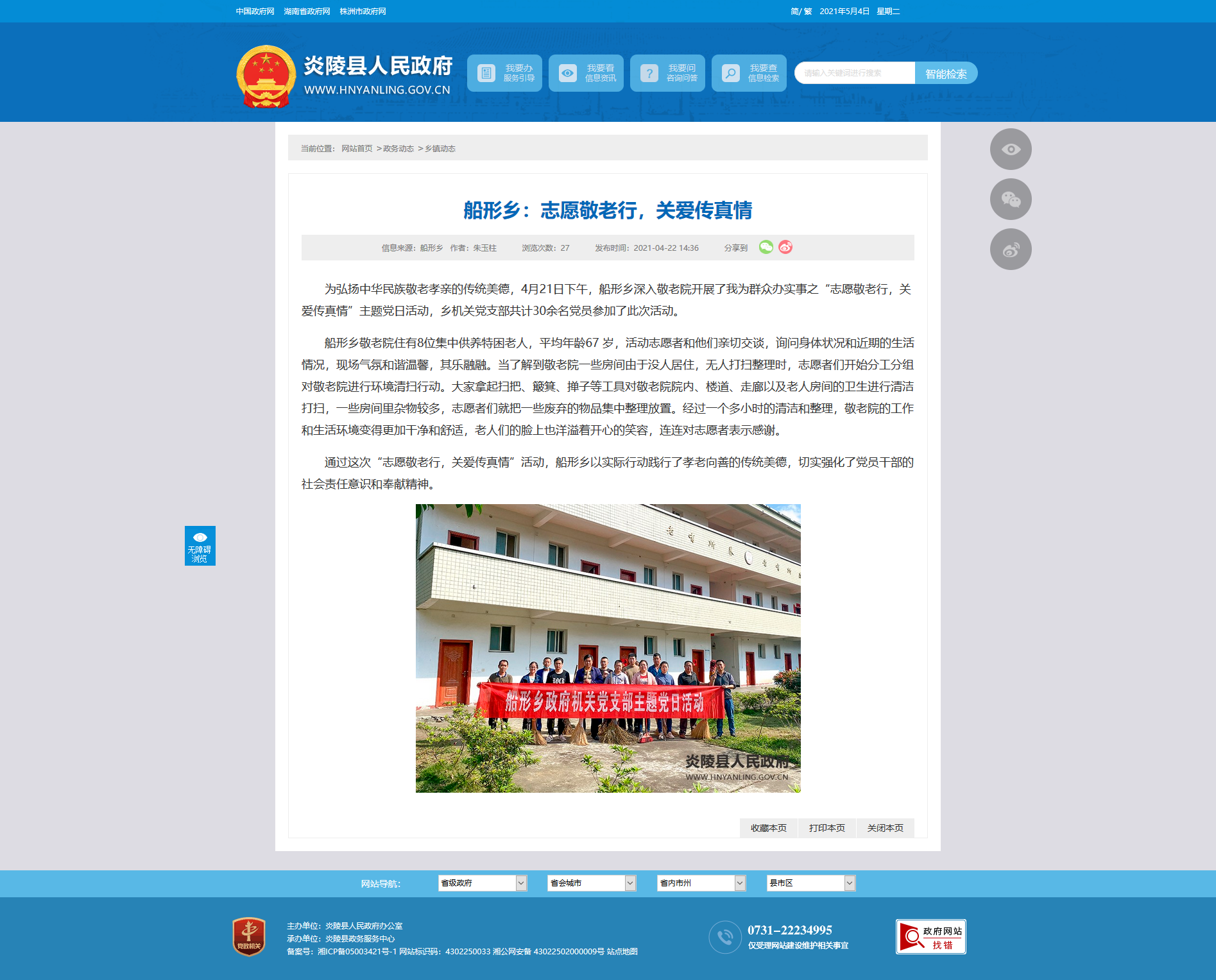 为弘扬中华民族敬老孝亲的传统美德,4月21日下午,船形乡深入敬老院开展了我为群众办实事之“志愿敬老行,关爱传真情”主题党日活动,乡机关党支部共计30余名党员参加了此次活动。