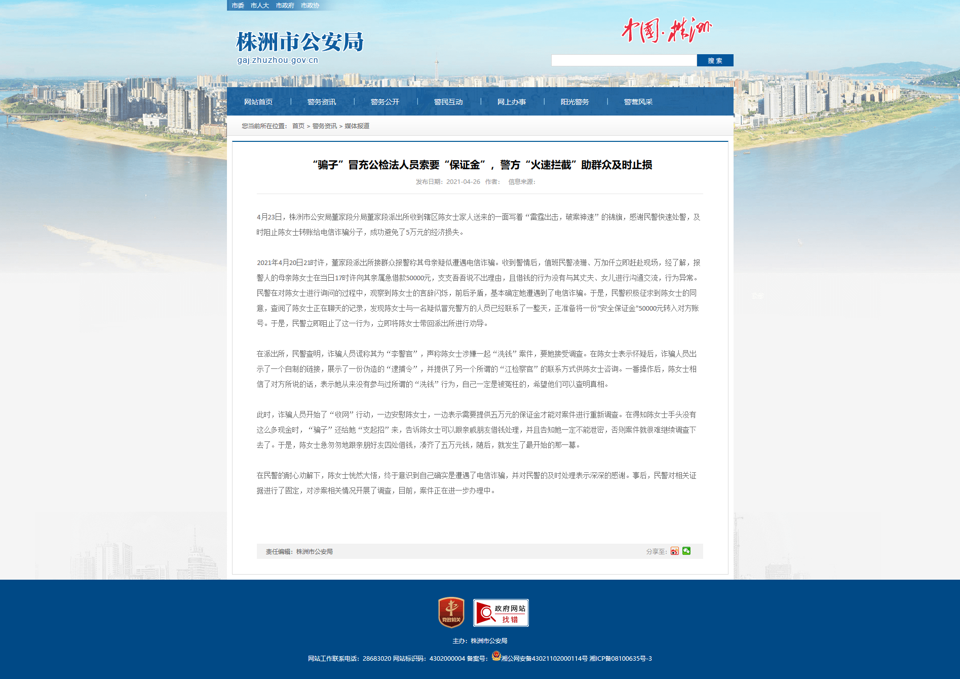 4月23日,株洲市公安局董家段分局董家段派出所收到辖区陈女士家人送来的一面写着“雷霆出击,破案神速”的锦旗,感谢民警快速处警,及时阻止陈女士转账给电信诈骗分子,成功避免了5万元的经济损失。