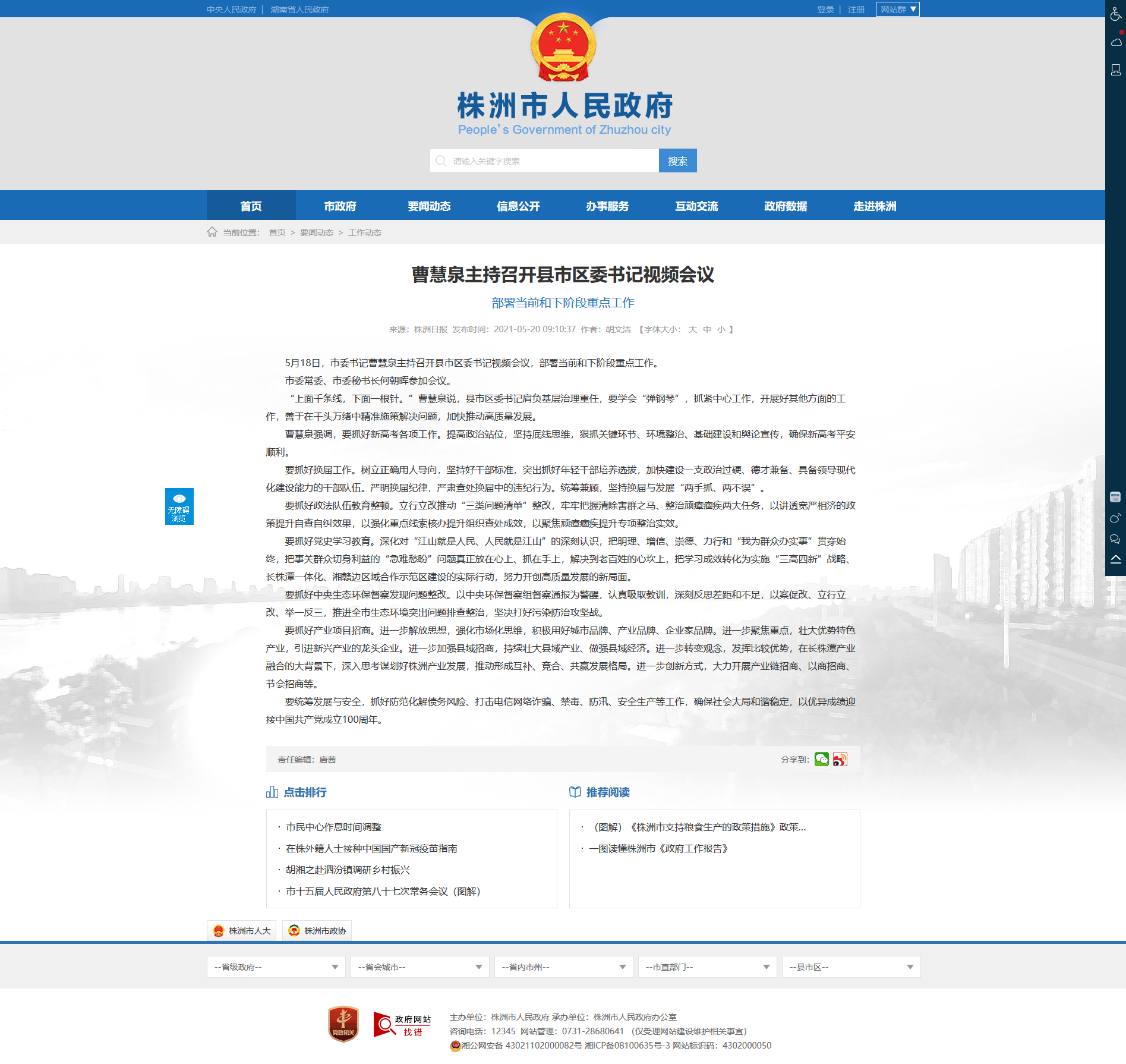5月18日,市委书记曹慧泉主持召开县市区委书记视频会议,部署当前和下阶段重点工作。