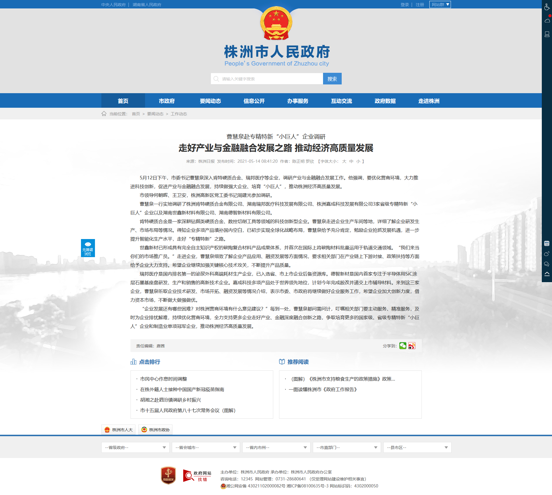5月12日下午,市委书记曹慧泉深入肯特硬质合金、瑞邦医疗等企业,调研产业与金融融合发展工作。他强调,要优化营商环境,大力推进科技创新,促进产业与金融融合发展,持续做强大企业、培育“小巨人”,推动株洲经济高质量发展。