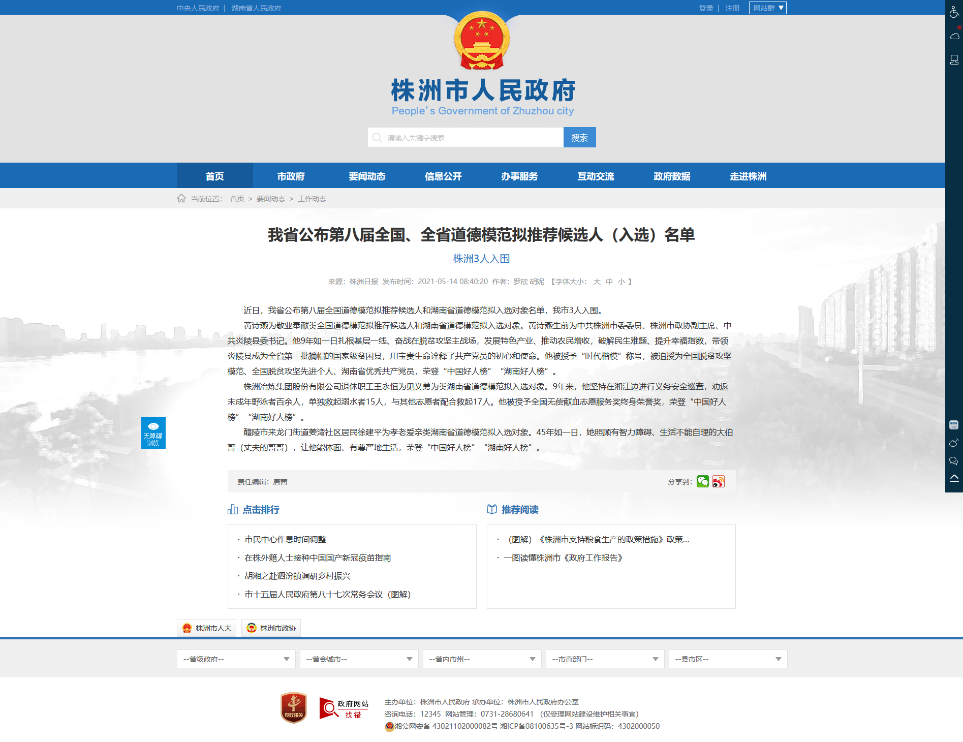 近日,我省公布第八届全国道德模范拟推荐候选人和湖南省道德模范拟入选对象名单,我市3人入围。