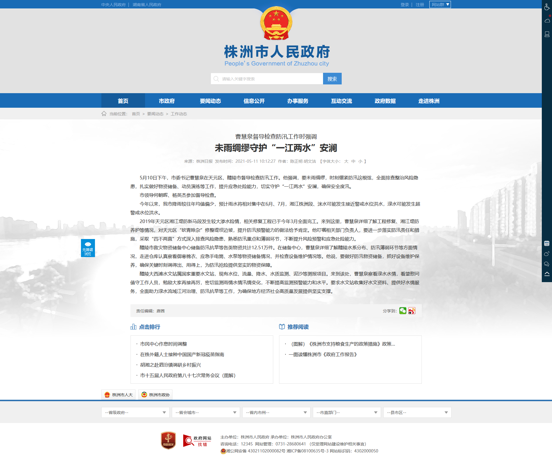 2019年天元区湘江堤防新马段发生较大渗水险情,相关修复工程已于今年3月全面完工。来到这里,曹慧泉详细了解工程修复、湘江堤防养护等情况,对天元区“砍青除杂”修整堤坝边坡,提升防汛预警能力的做法给予肯定。他叮嘱相关部门负责人,要进一步落实防汛责任和措施,采取“四不两直”方式深入排查风险隐患,熟悉防汛重点和薄弱环节,不断提升风险预警和应急处险能力。