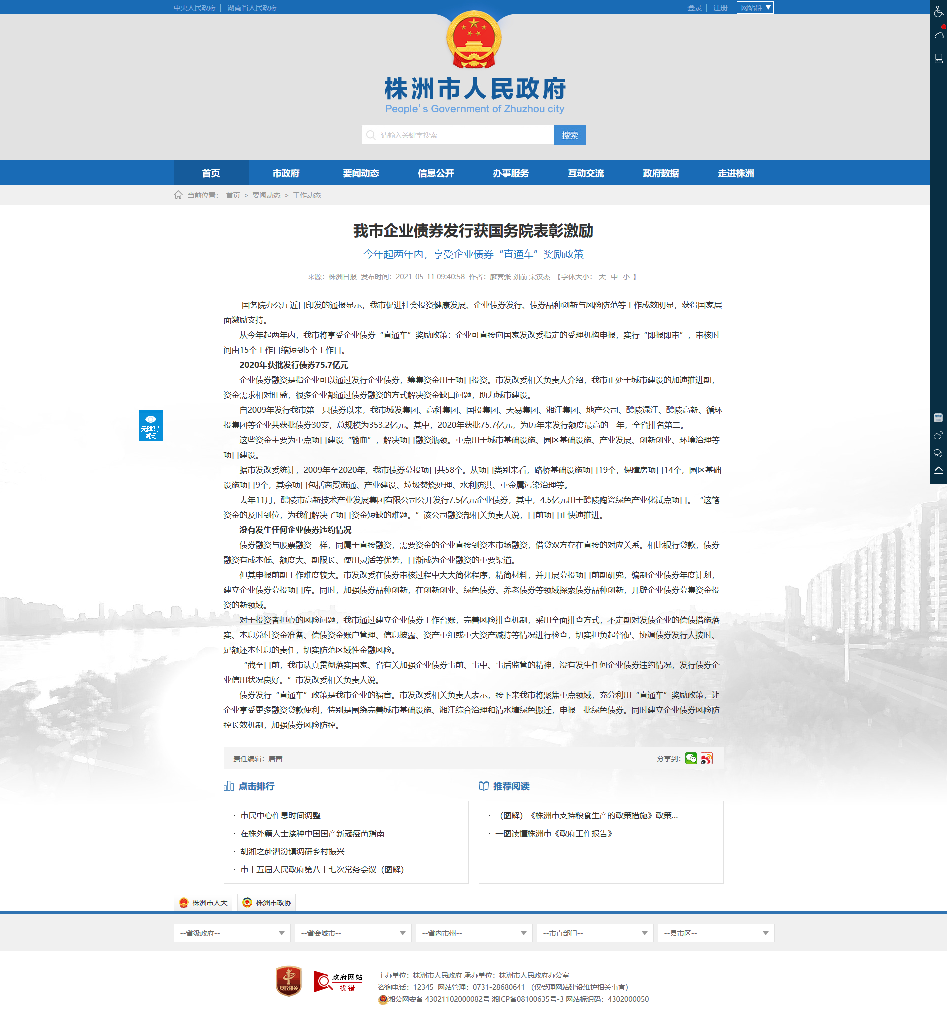 债券发行“直通车”政策是我市企业的福音。市发改委相关负责人表示,接下来我市将聚焦重点领域,充分利用“直通车”奖励政策,让企业享受更多融资贷款便利,特别是围绕完善城市基础设施、湘江综合治理和清水塘绿色搬迁,申报一批绿色债券。同时建立企业债券风险防控长效机制,加强债券风险防控。