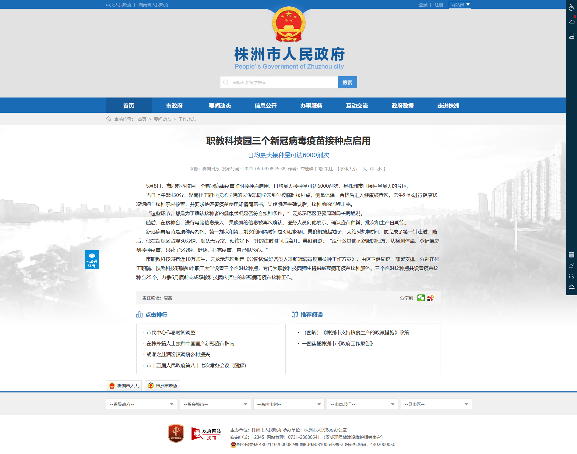 5月8日,市职教科技园三个新冠病毒疫苗临时接种点启用,日均最大接种量可达6000剂次,是株洲市日接种量最大的片区。