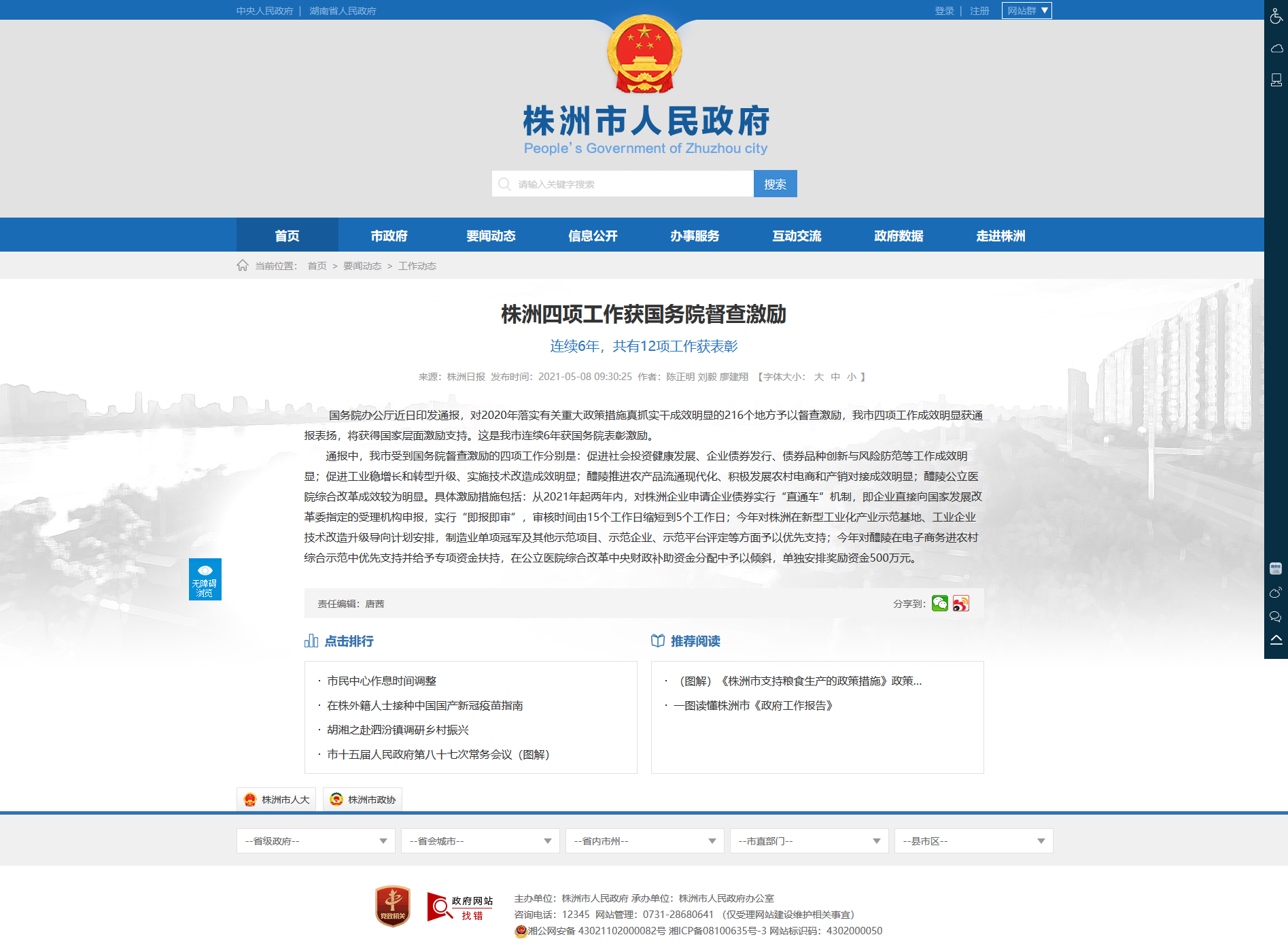 通报中,我市受到国务院督查激励的四项工作分别是:促进社会投资健康发展、企业债券发行、债券品种创新与风险防范等工作成效明显;促进工业稳增长和转型升级、实施技术改造成效明显;醴陵推进农产品流通现代化、积极发展农村电商和产销对接成效明显;醴陵公立医院综合改革成效较为明显。具体激励措施包括:从2021年起两年内,对株洲企业申请企业债券实行“直通车”机制,即企业直接向国家发展改革委指定的受理机构申报,实行“即报即审”,审核时间由15个工作日缩短到5个工作日;今年对株洲在新型工业化产业示范基地、工业企业技术改造升级导向计划安排,制造业单项冠军及其他示范项目、示范企业、示范平台评定等方面予以优先支持;今年对醴陵在电子商务进农村综合示范中优先支持并给予专项资金扶持,在公立医院综合改革中央财政补助资金分配中予以倾斜,单独安排奖励资金500万元。