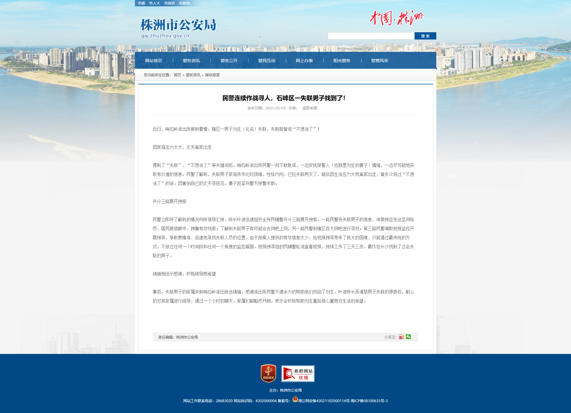 民警立即将了解到的情况向所领导汇报,所长叶波迅速组织全所民辅警兵分三路展开搜索。一路民警将失联男子的信息、体貌特征发送至网格员、居民微信群中,搜集有效线索;了解到失联男子有可能会去网吧上网,另一路民警到辖区各大网吧进行寻找;第三路民警调取视频监控开展搜寻,争取更精准、迅速地寻找失联人员的位置。由于报案人提供的有效信息太少,给视频搜寻带来了极大的困难,只能通过最传统的方式,不放过任何一个时间段和任何一个角度的监控画面。视频搜寻组的民辅警轮流查看视频,持续工作了三天三夜,最终在长沙找到了这名失联的男子。